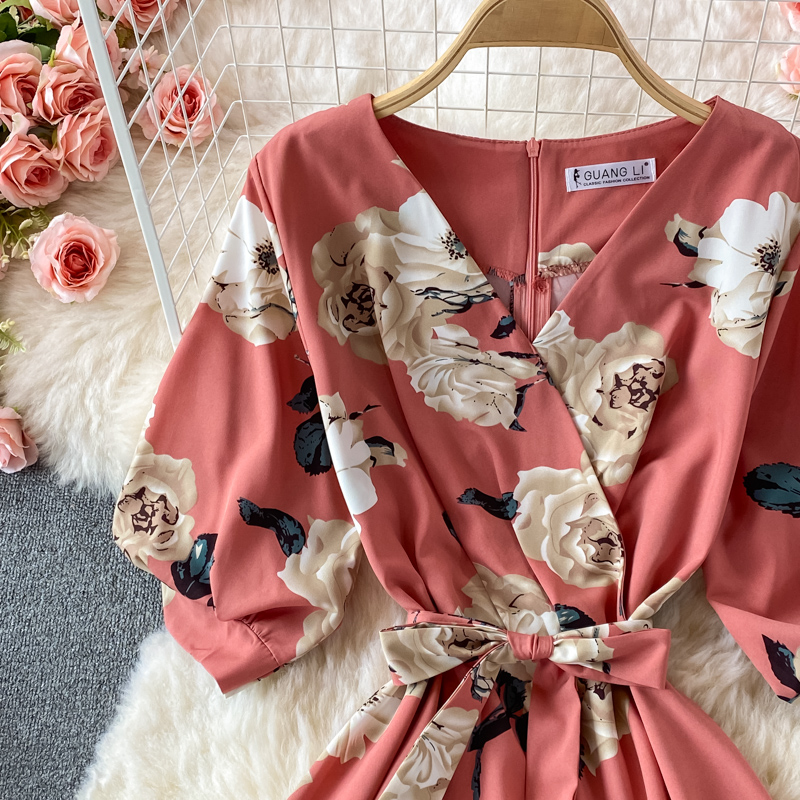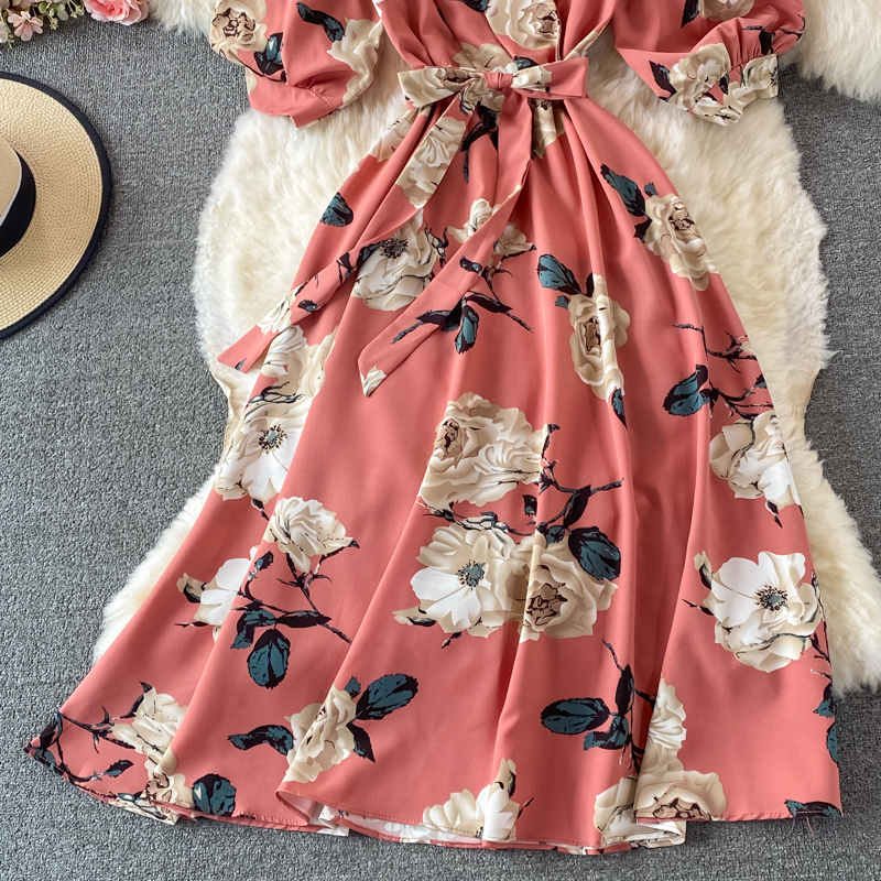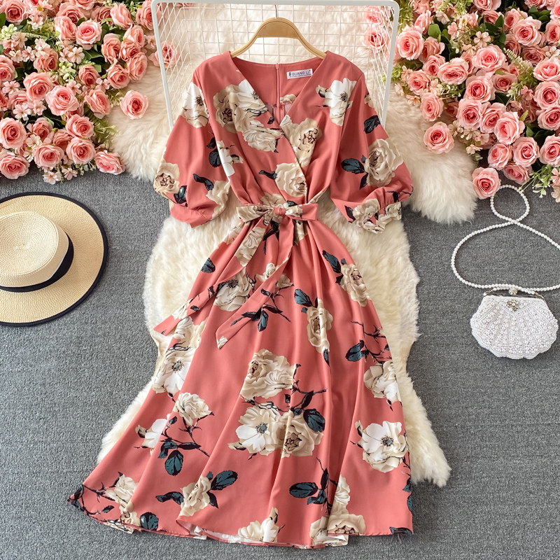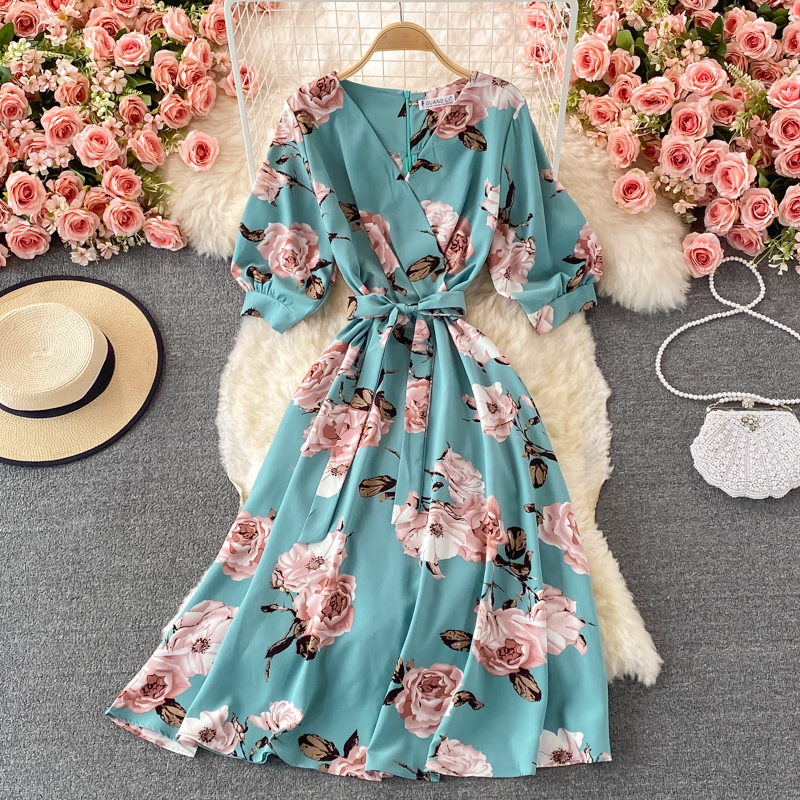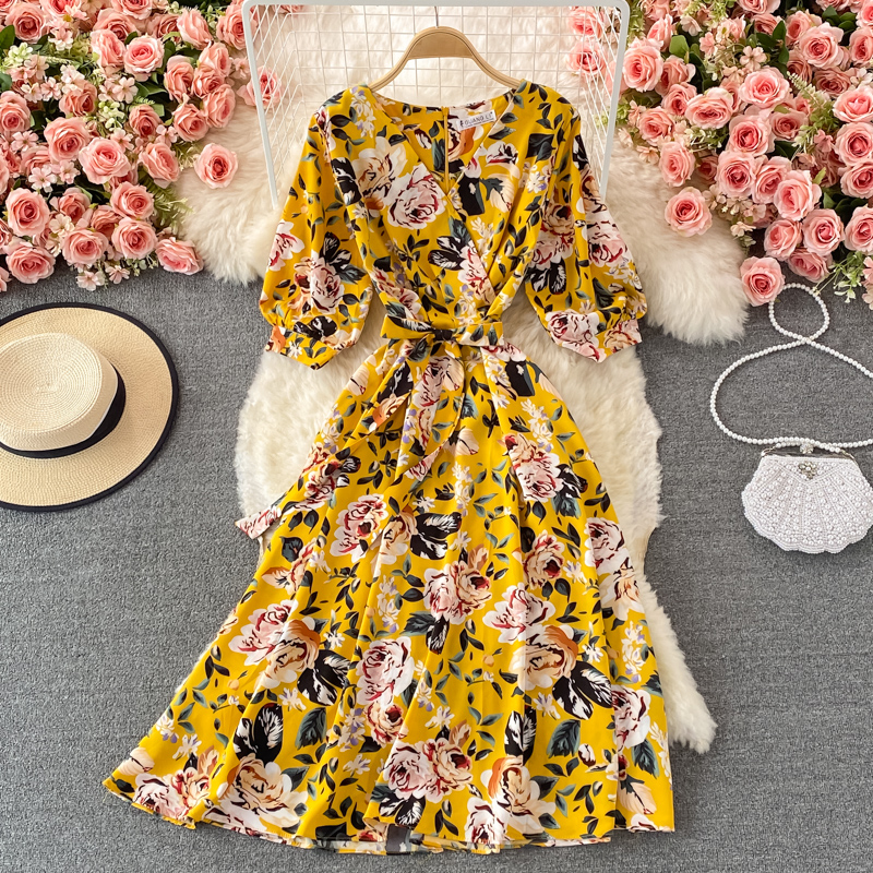 Cheap Dresses, Buy Quality Women’s Clothing Directly from China Suppliers:Summer Floral Midi Dress Women Vintage V Neck Puff Short Sleeve High Waist A Line Casual Vestidos Female Elegant Robe New