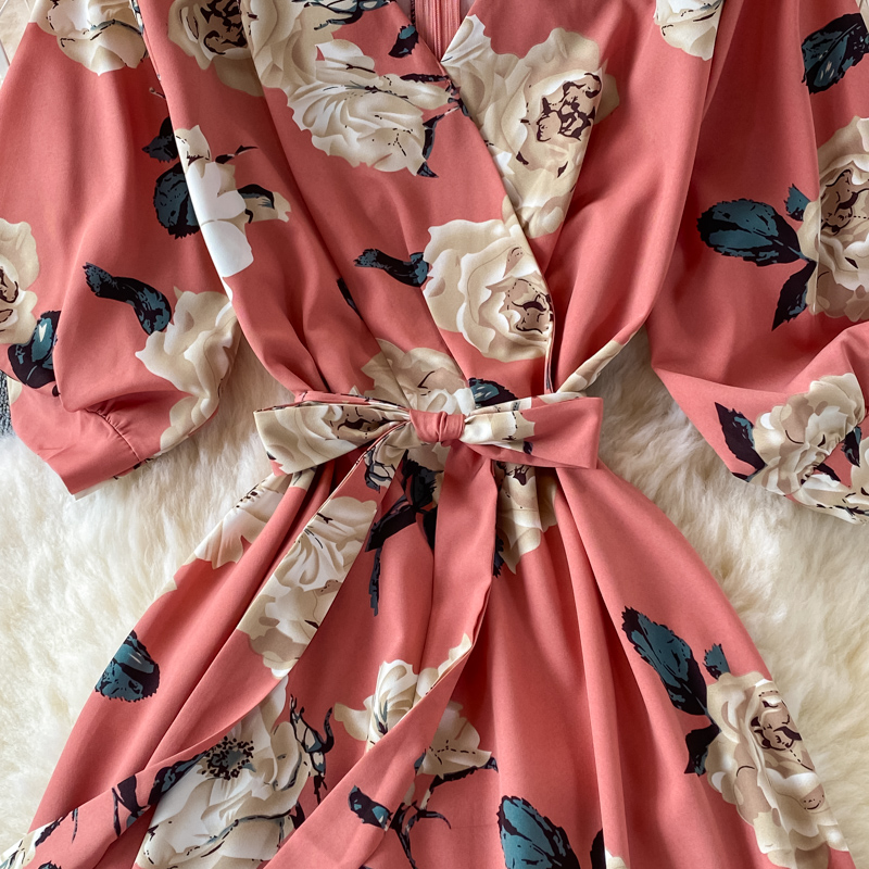Summer Floral Midi Dress Women Vintage V-Neck Puff Short Sleeve High Waist A-Line Casual Vestidos Female Elegant Robe New