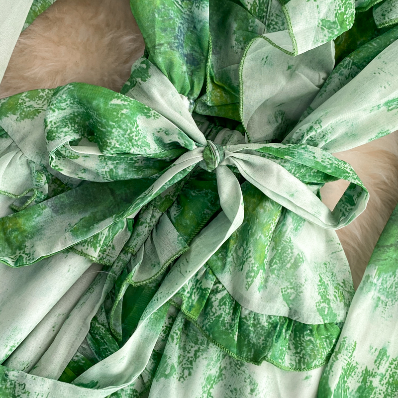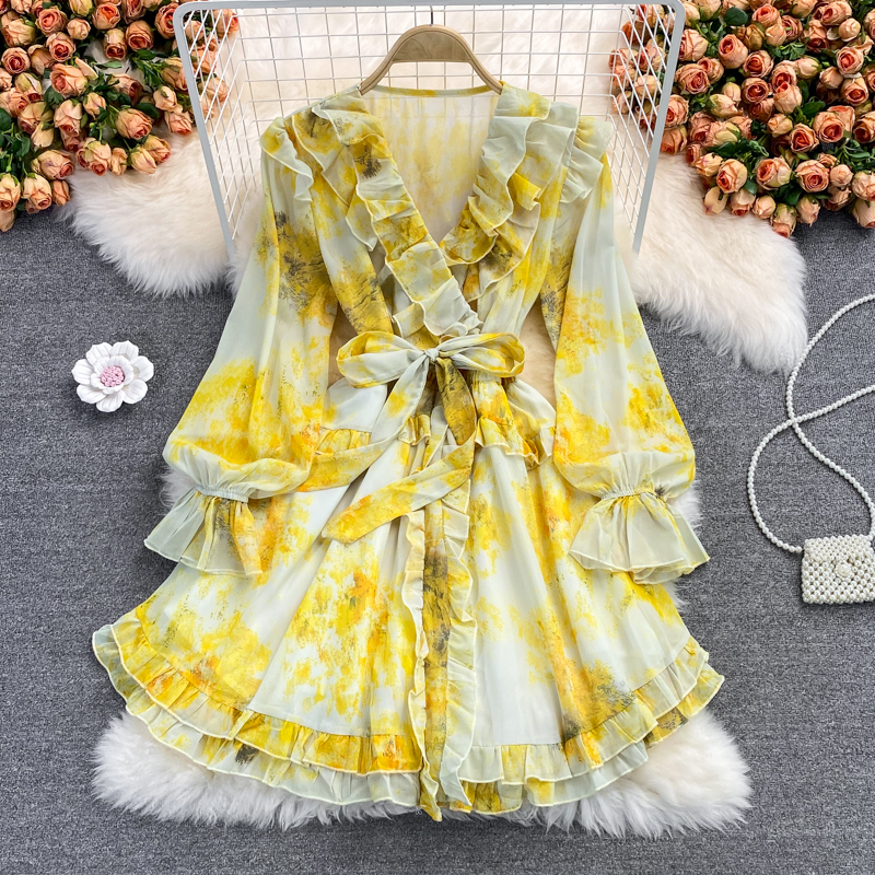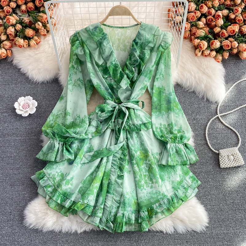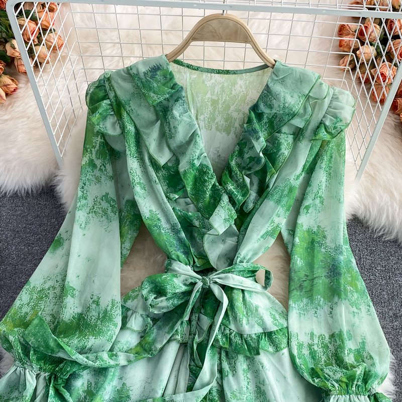 Bohemian Printed Chiffon Mini Dress For Women Autumn Sexy V-Neck Ruffle Flare Long Sleeve High Waist Vacation Beach Vestidos New