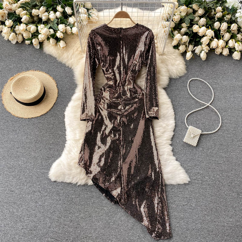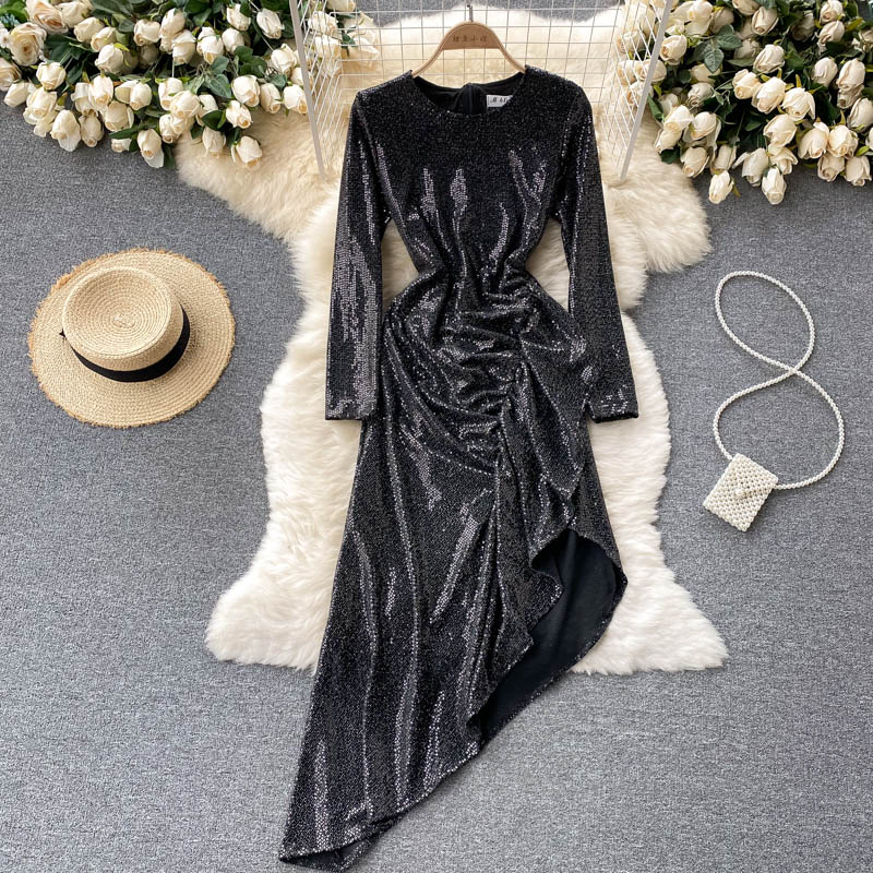 Cheap Dresses, Buy Quality Women’s Clothing Directly from China Suppliers:Gold/Black Sexy Sequins Irregular Long Dress Women Elegant O Neck Long Sleeve Ruffle Party Vestidos Female Slim Robe Autumn
