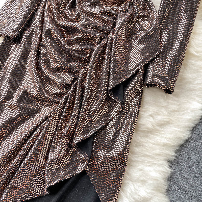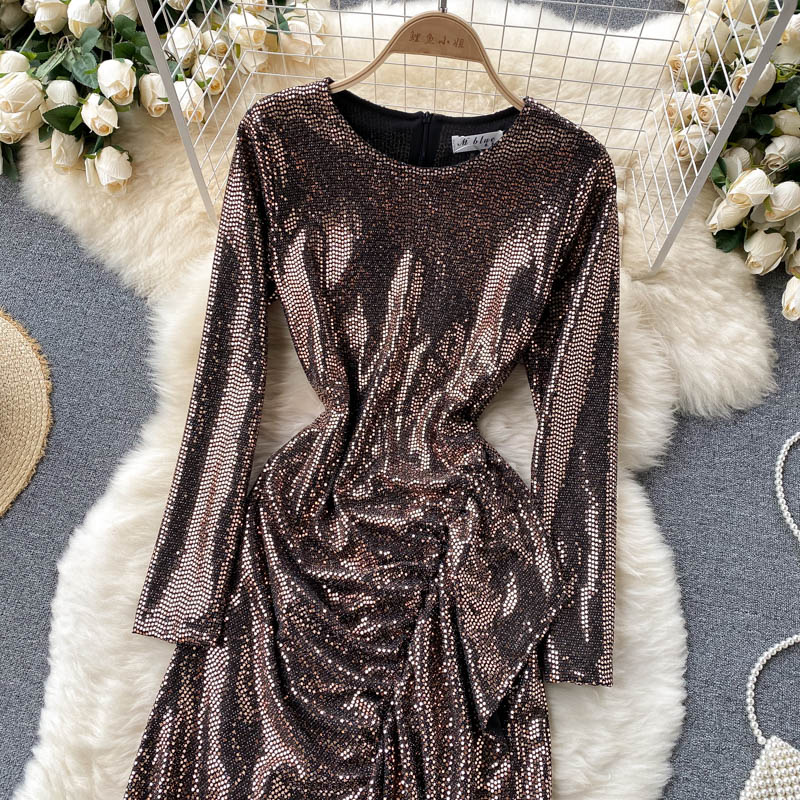 Gold/Black Sexy Sequins Irregular Long Dress Women Elegant O-Neck Long Sleeve Ruffle Party Vestidos Female Slim Robe Autumn
