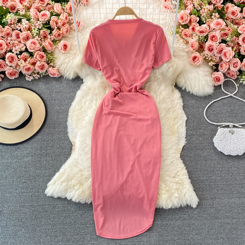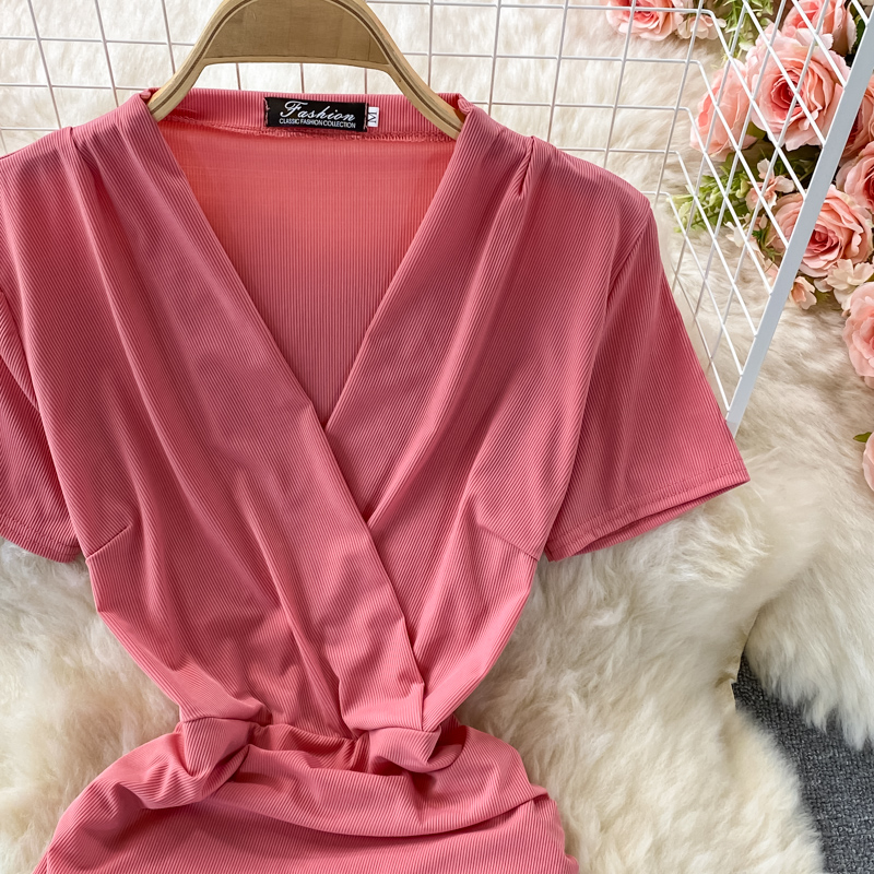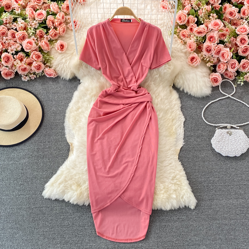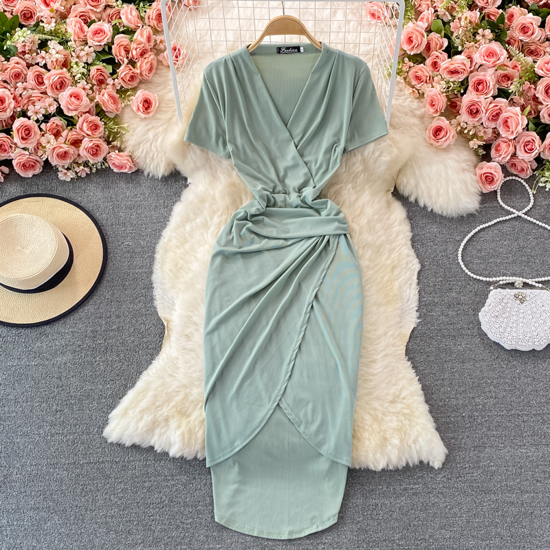 Cheap Dresses, Buy Quality Women’s Clothing Directly from China Suppliers:Vintage Black/Green Draped Bodycon Midi Dress For Women Summer Casual V Neck Short Sleeve High Waist Party Robe Female New