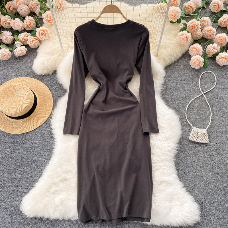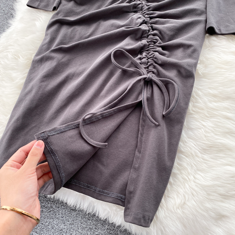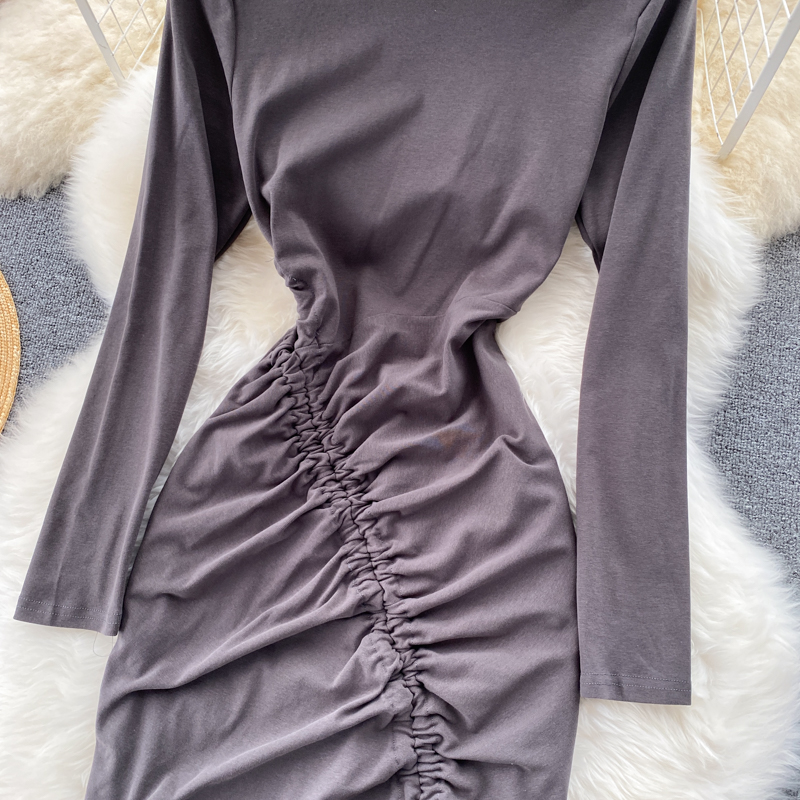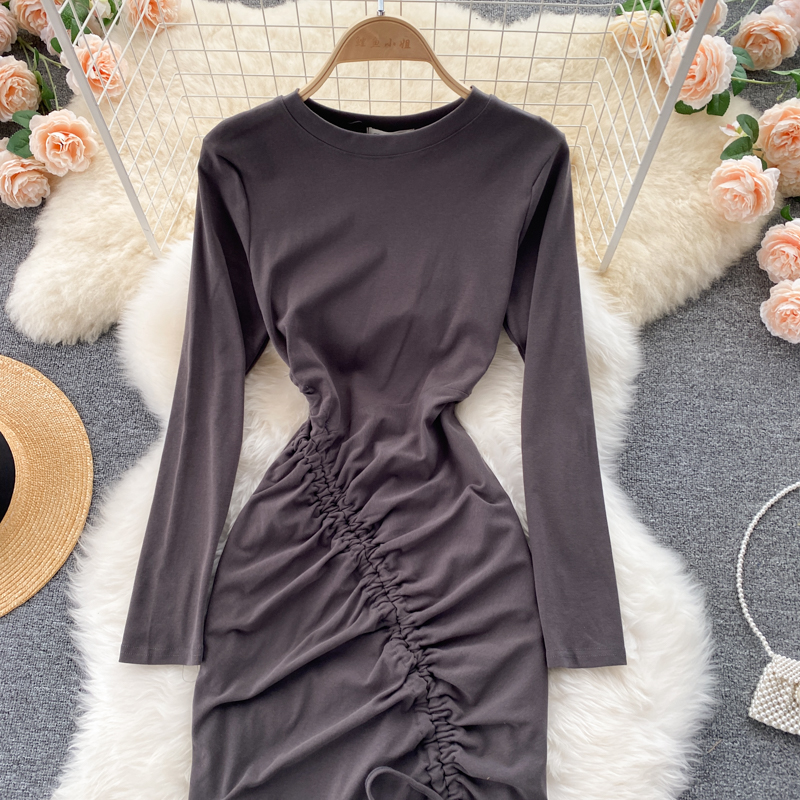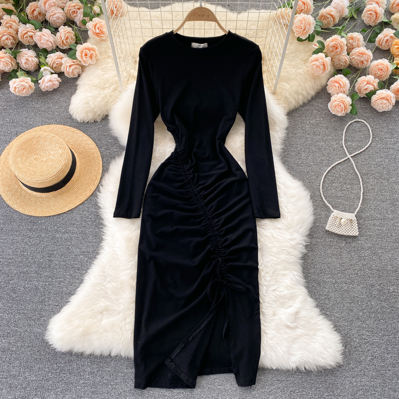 Autumn Women Drawstring Bodycon Dress Vintage Round Neck Long Sleeve High Waist Slim Split Casual Sheath Vestidos Fashion