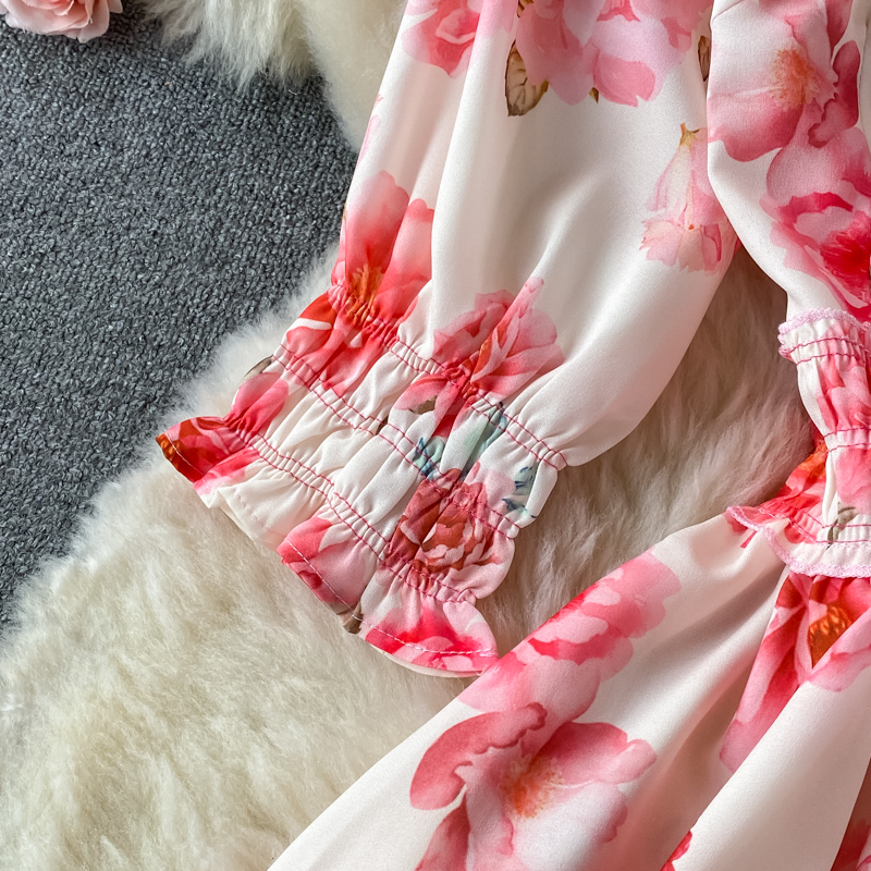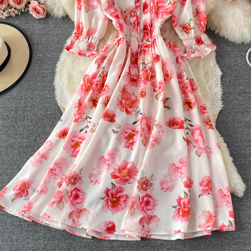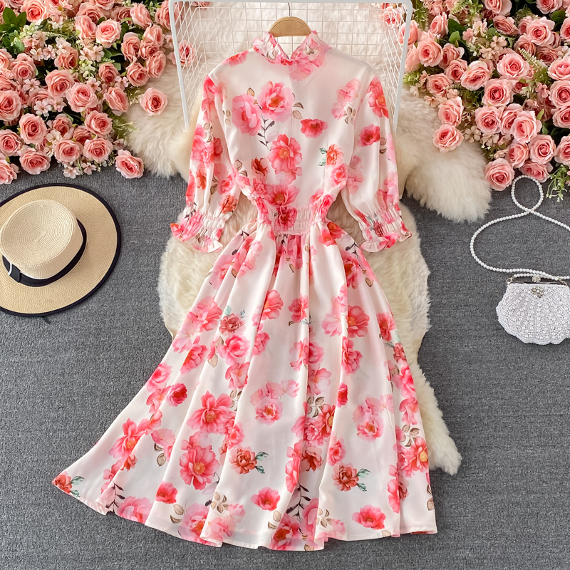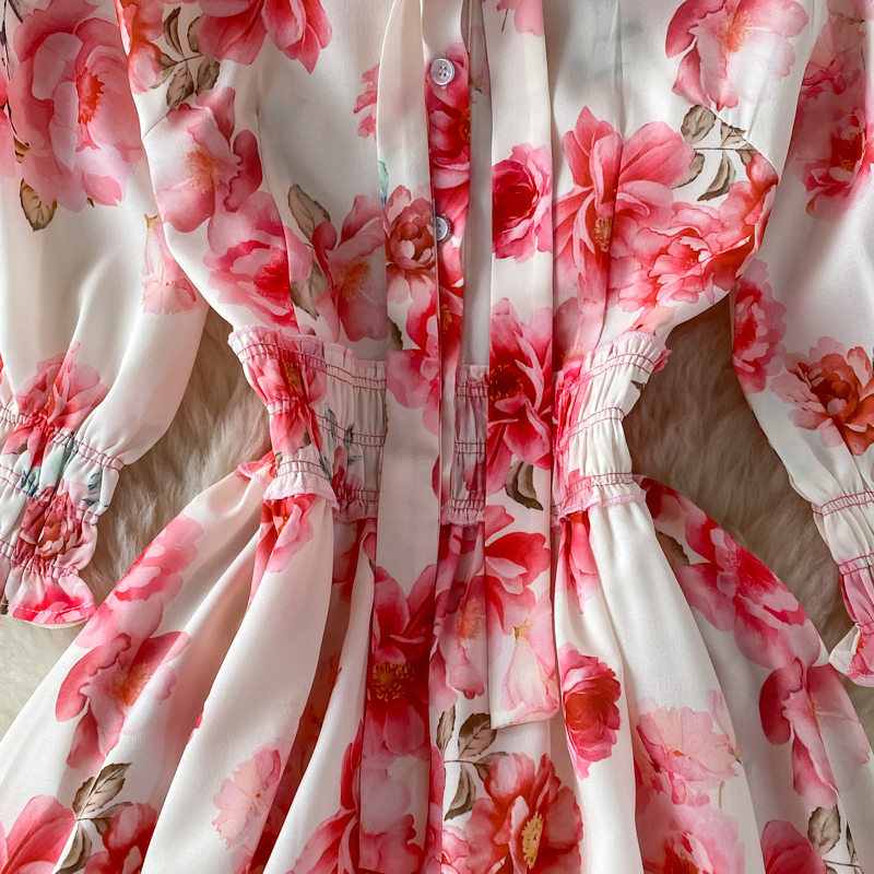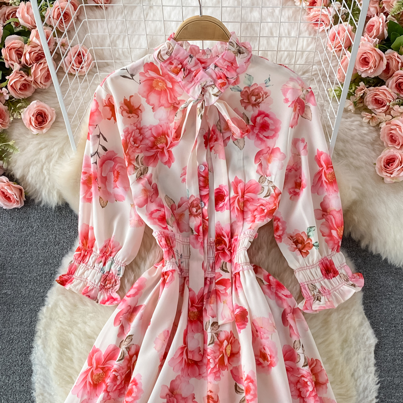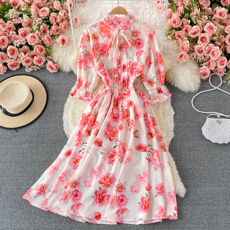 Vintage Women Pink Floral Midi Dress Autumn Elegant Bow Stand Collar High Waist A-Line Vestidos Female Party Robe New