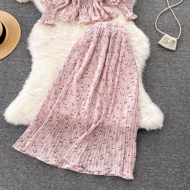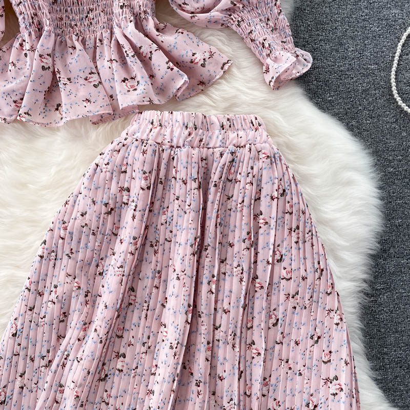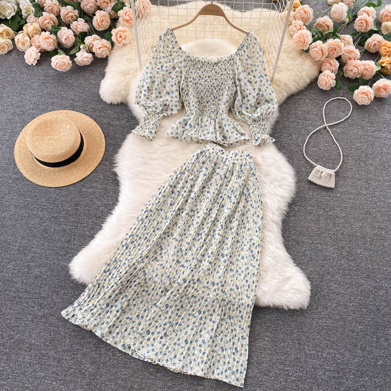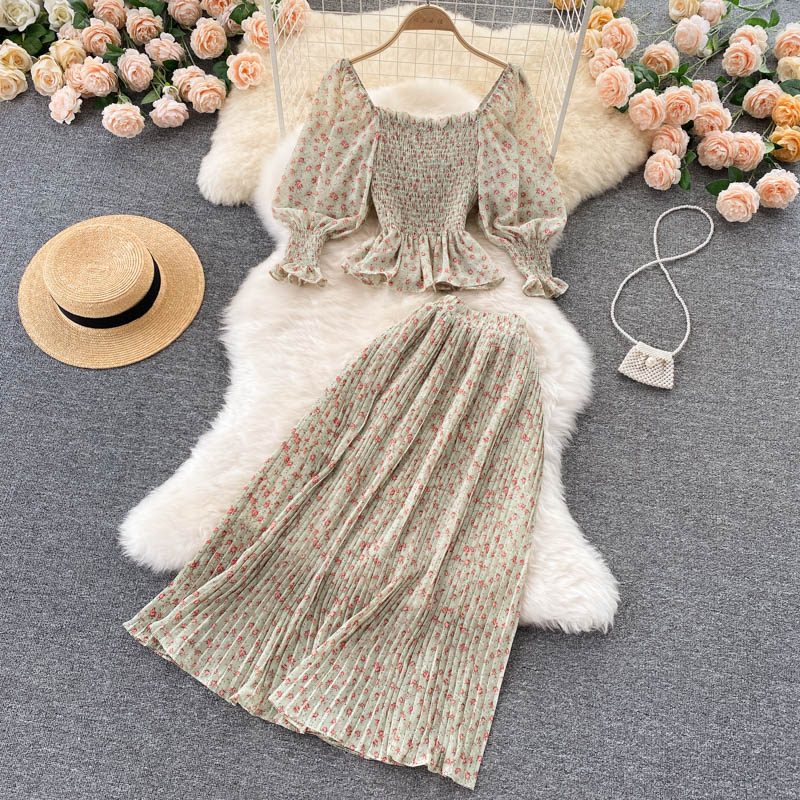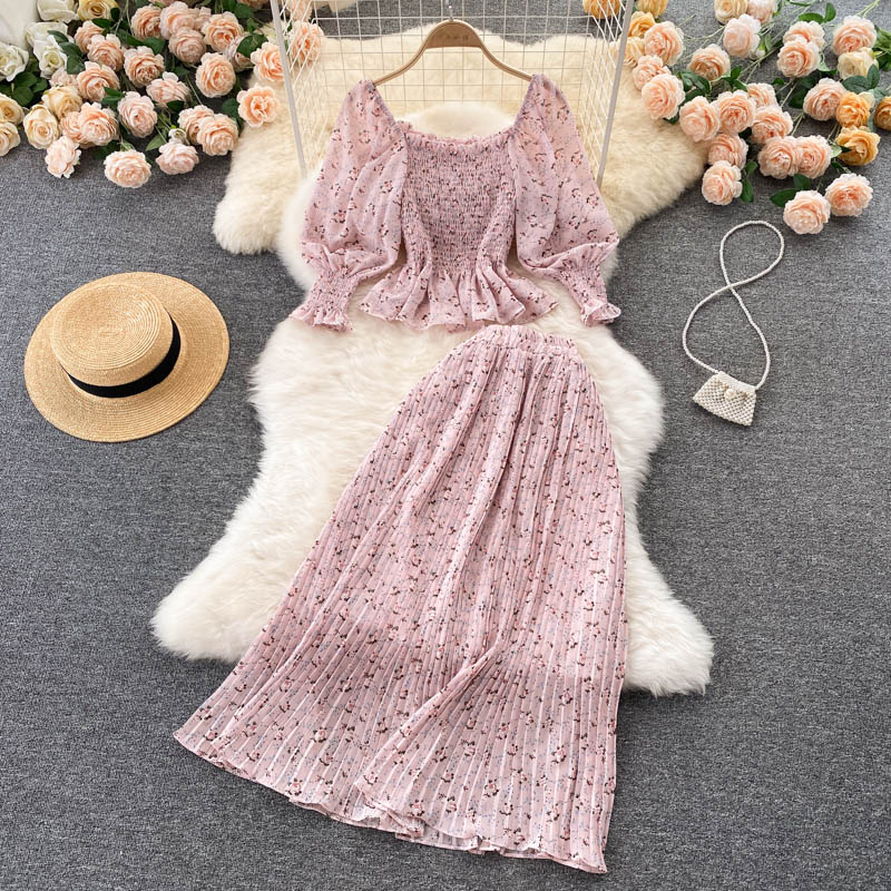 Cheap Dress Suits, Buy Quality Women’s Clothing Directly from China Suppliers:Autumn Black/Yellow/Pink Printed Two Piece Set Women Vintage Square Collar Draped Ruffle Blouse + Pleated Skirt Female Suit