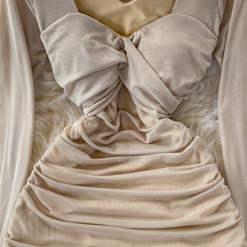 Autumn Sexy Draped Bodycon Mini Dress Women Blue/White/Khaki Twist Mesh Long Sleeve Club Party Vestidos Ladies New Fashion
