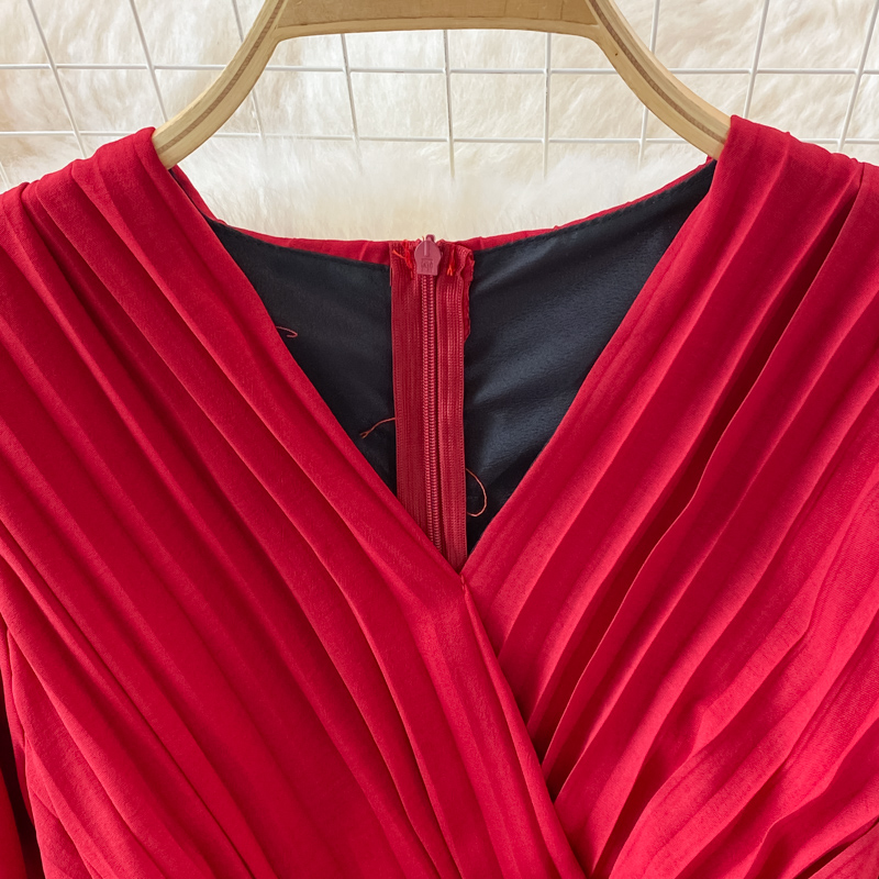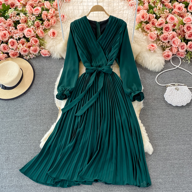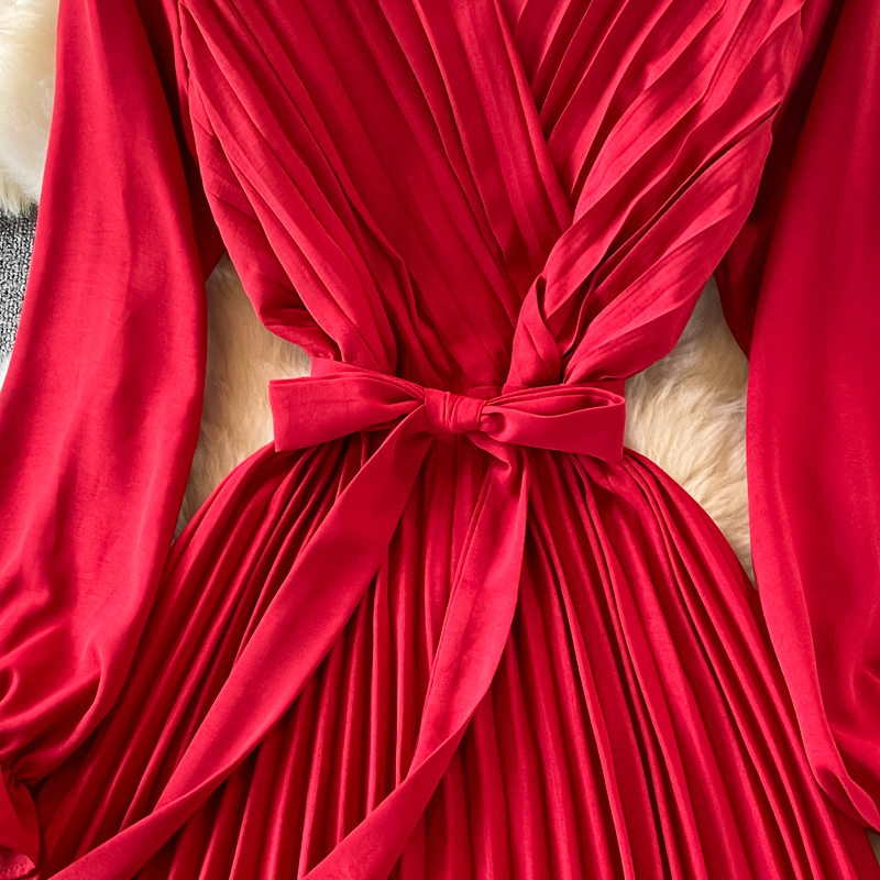 Autumn Women Pleated Midi Dress Vintage Red/Purple/Green Draped Party Vestidos Elegant Casual High Waist Long Sleeve Robe