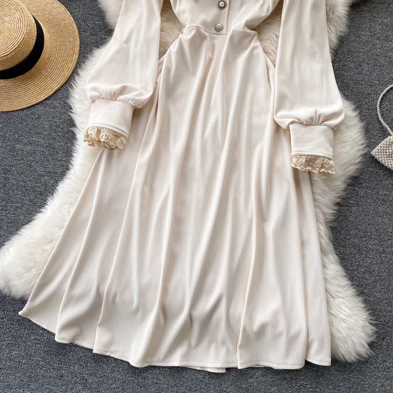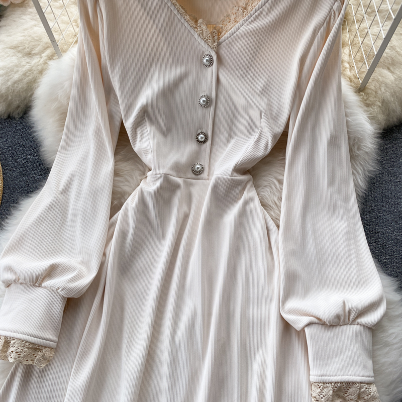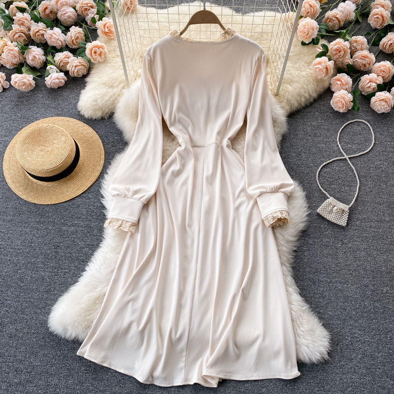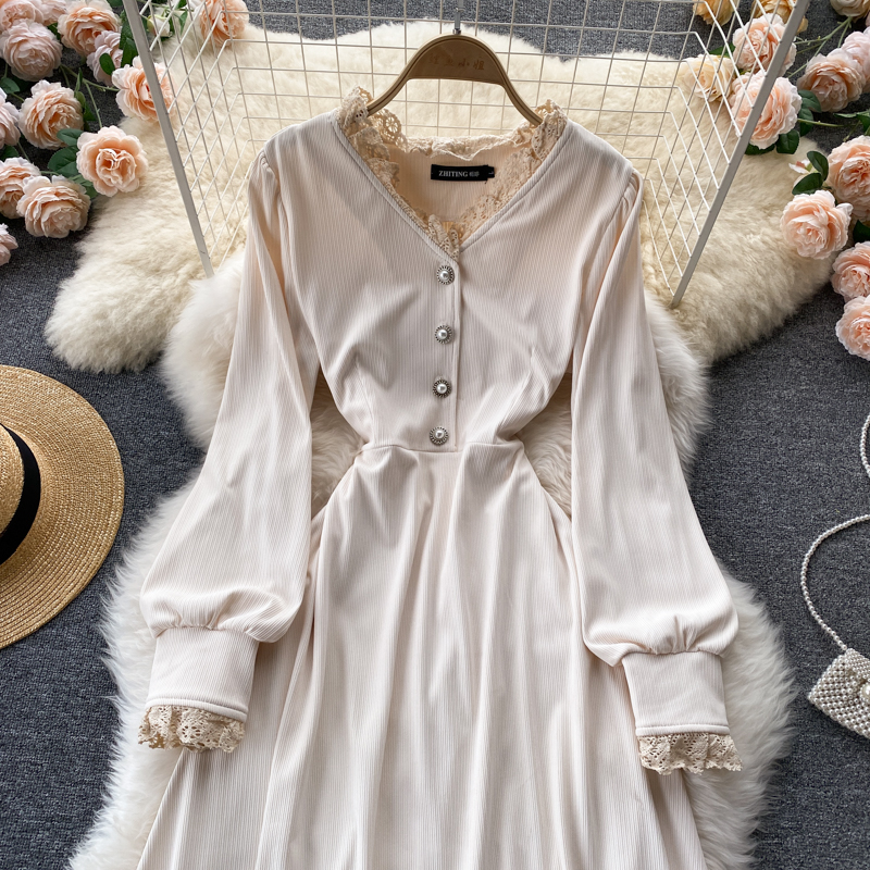 Cheap Dresses, Buy Quality Women’s Clothing Directly from China Suppliers:Autumn Vintage Beige Lace Midi Dress For Women Elegant V Neck Lantern Long Sleeve A Line Slim Casual Vestidos Female New