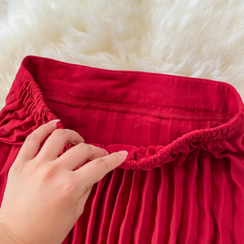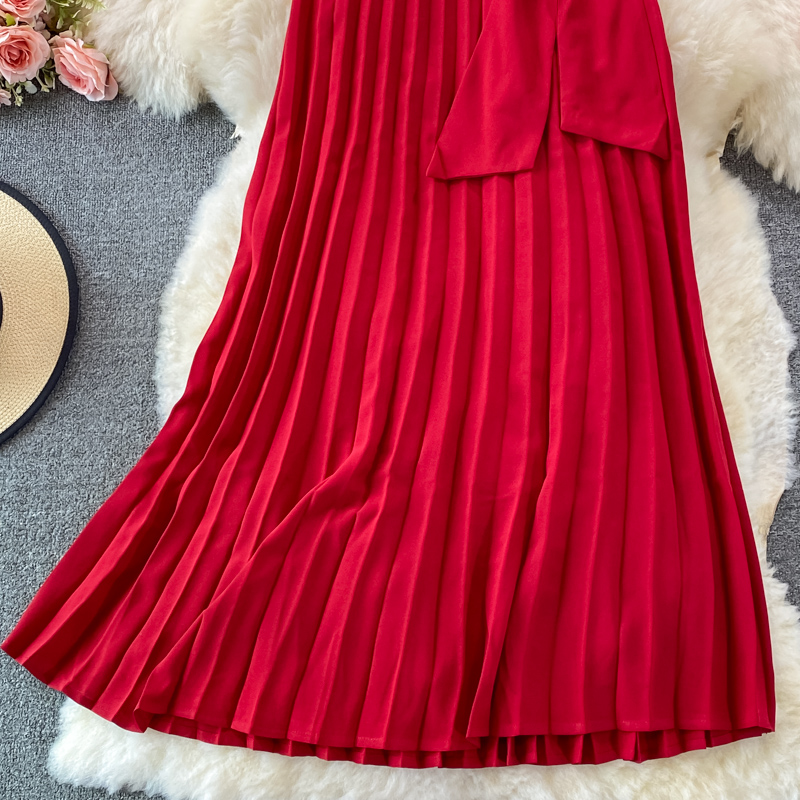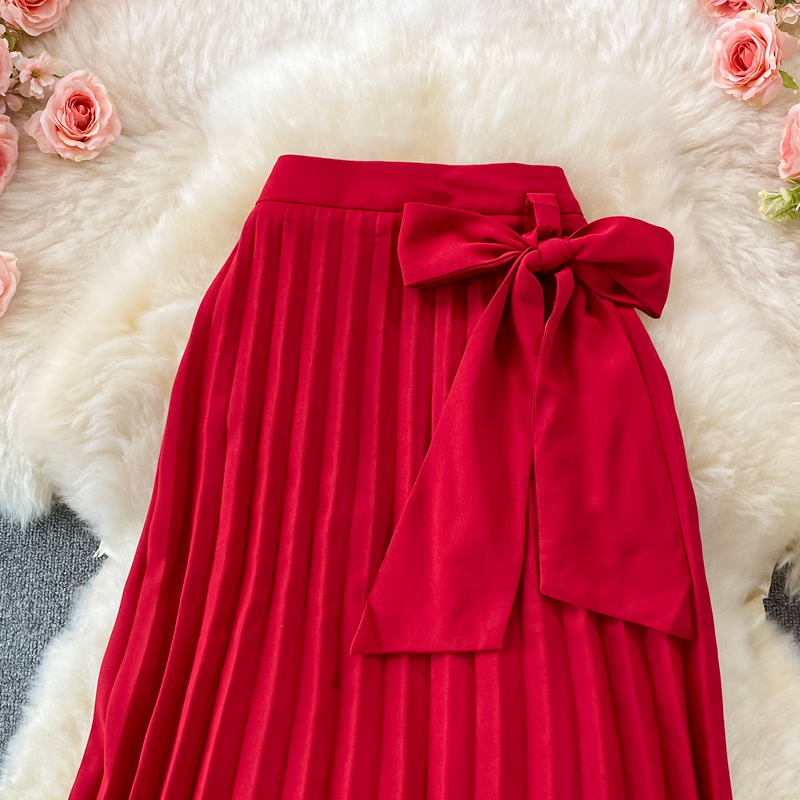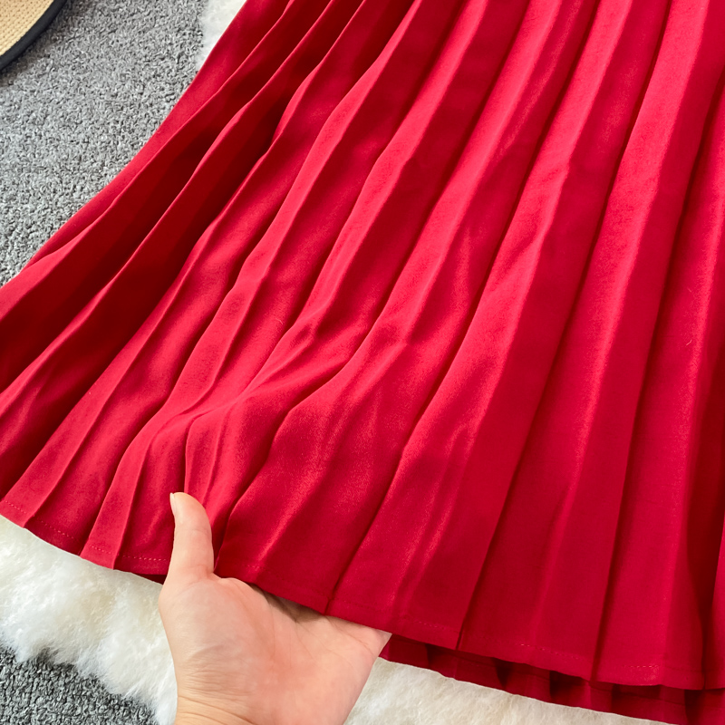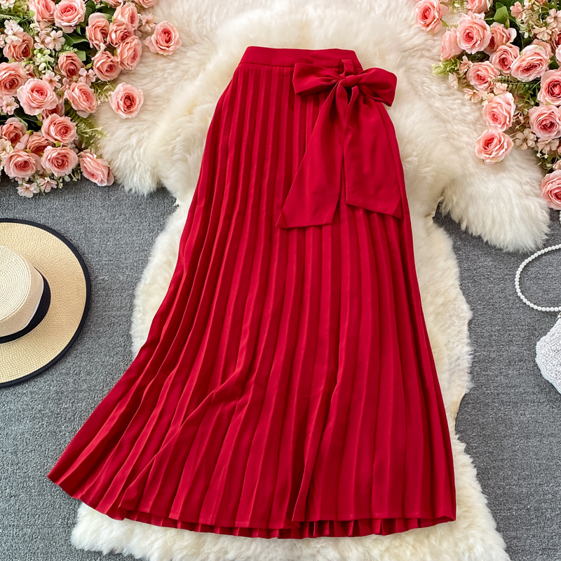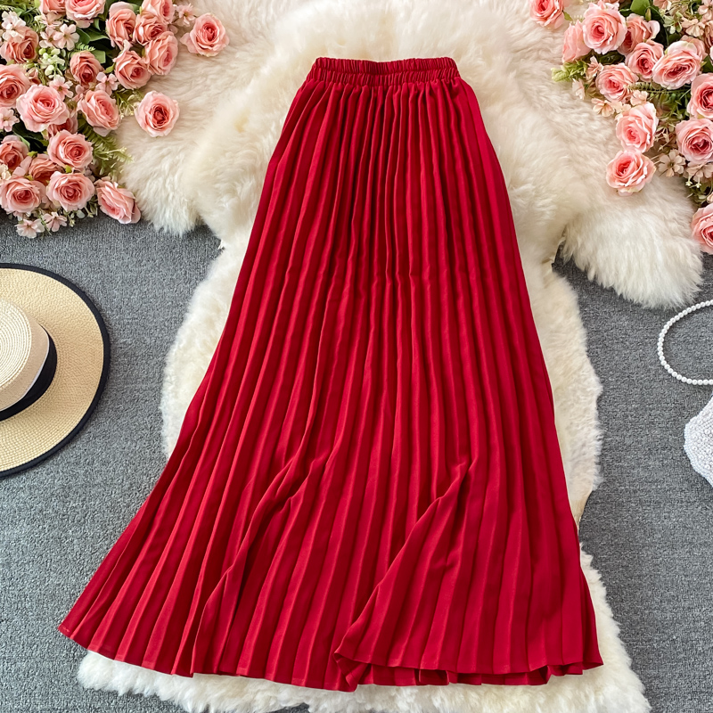 Autumn Women Red Pleated Midi Skirt Vintage High Waist Draped Party Faldas Female Elegant Big Swing Loose Saias New Fashion