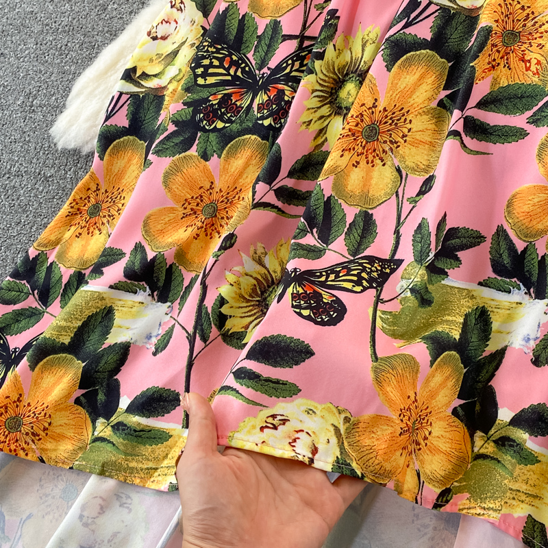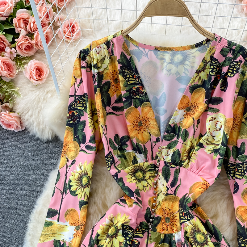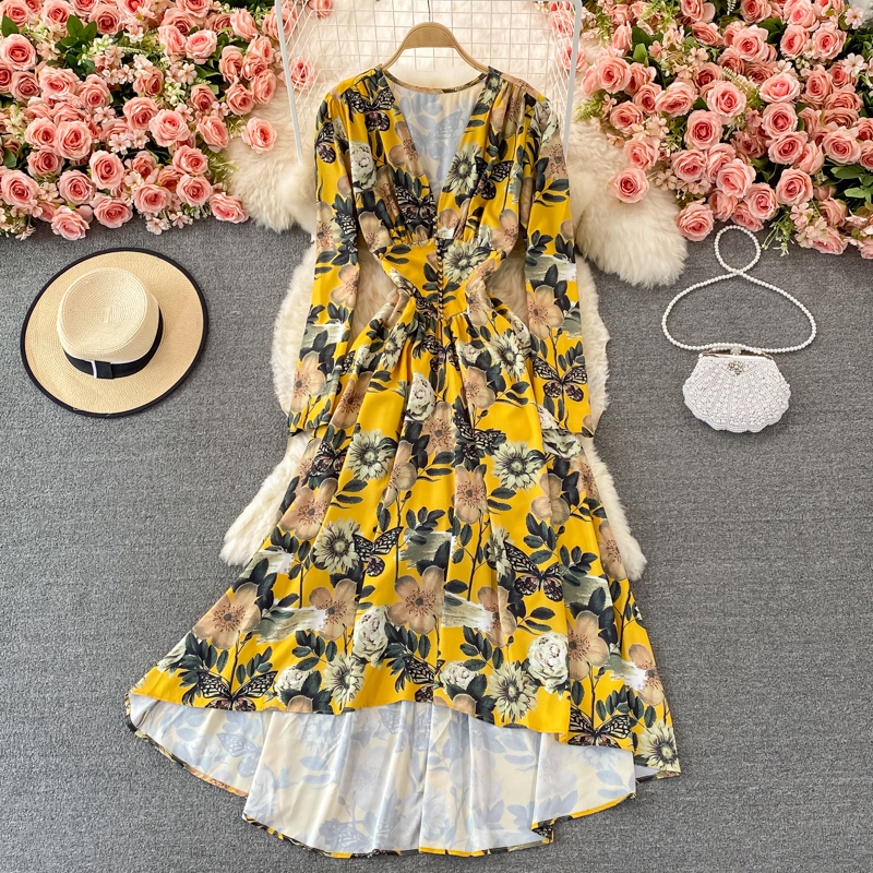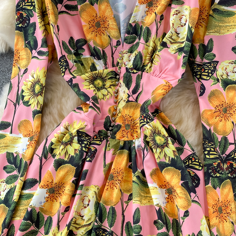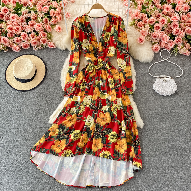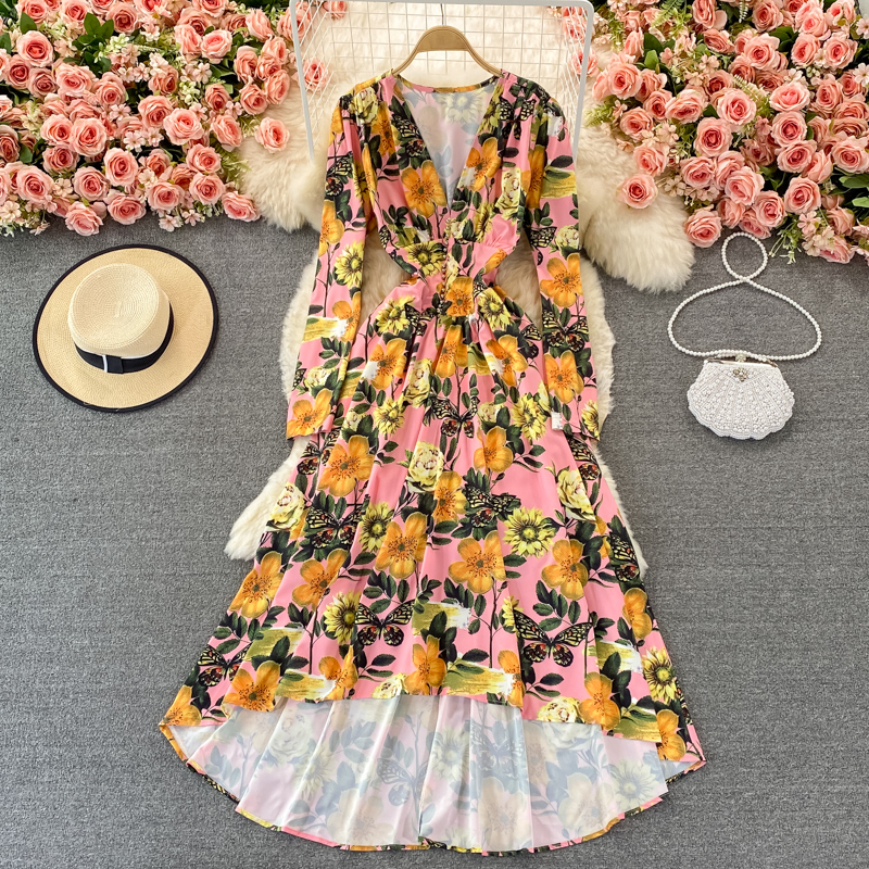 Bohemian Vacation Beach Long Dress Women Sexy V-Neck High Waist Printed Irregular Maxi Vestidos Female Pink/Red Party Robe