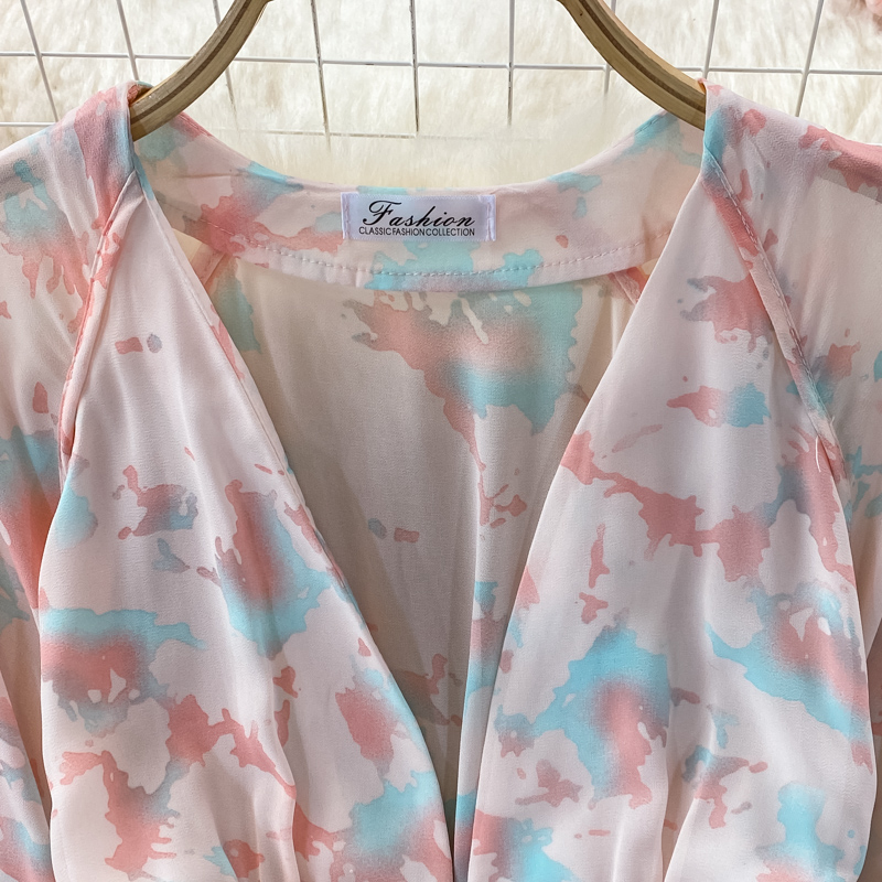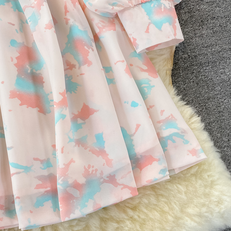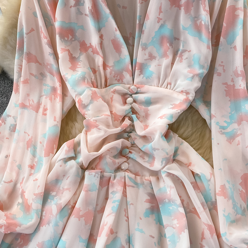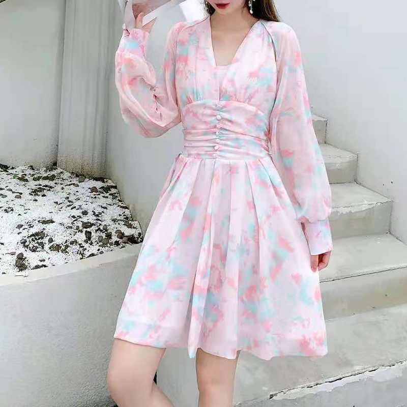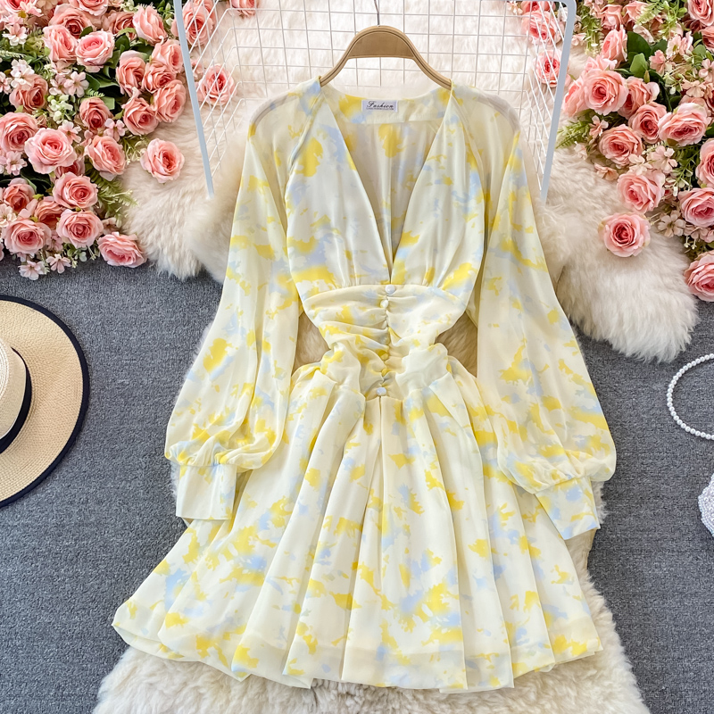Autumn Purple/Yellow/Pink Tie Dye Chiffon Party Dress Women Sexy V-Neck Lantern Long Sleeve A-Line Mini Vestidos Female New