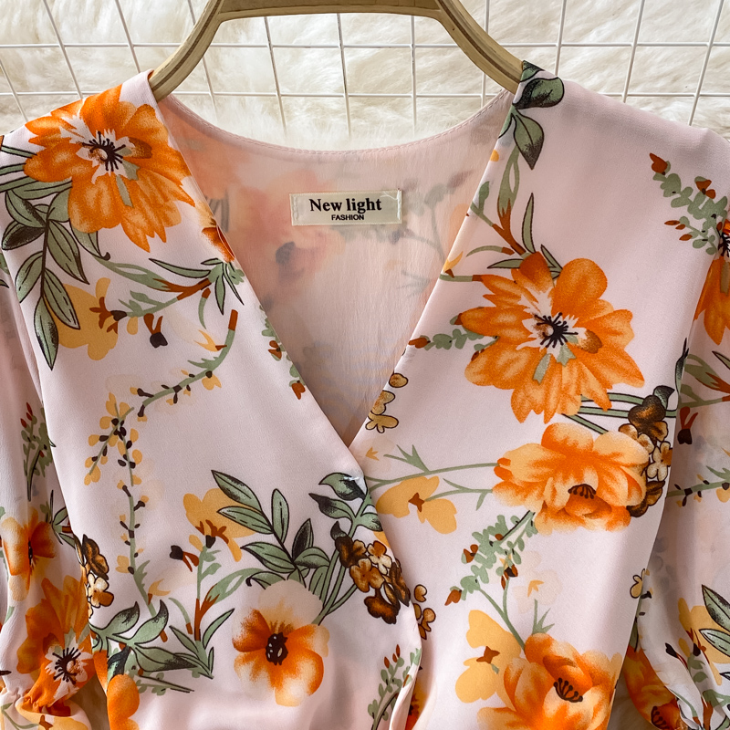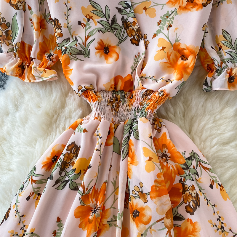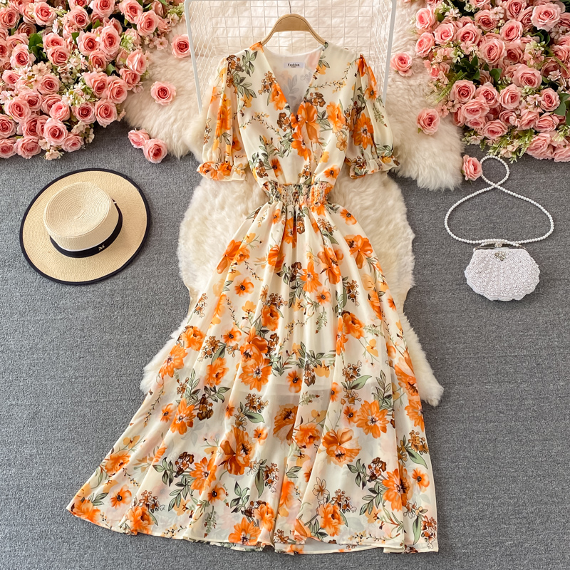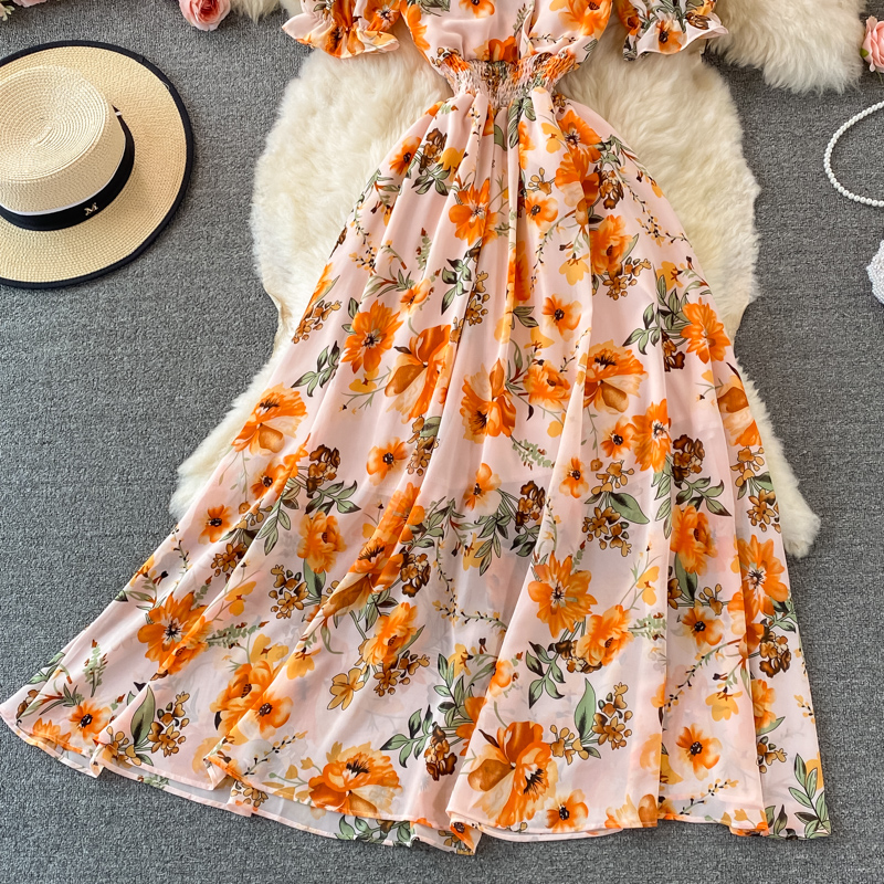 Summer Bohemian Women Chiffon Long Dress Women Sexy V-Neck Flare Short Sleeve High Waist A-Line Party Maxi Robe Female New