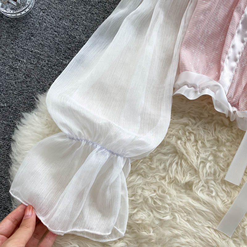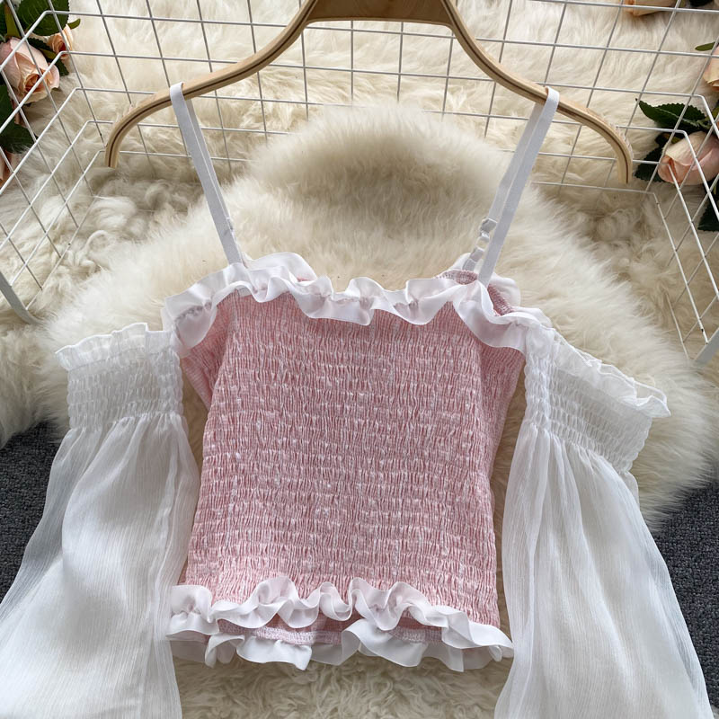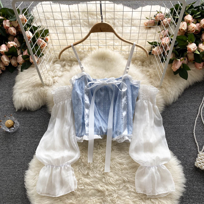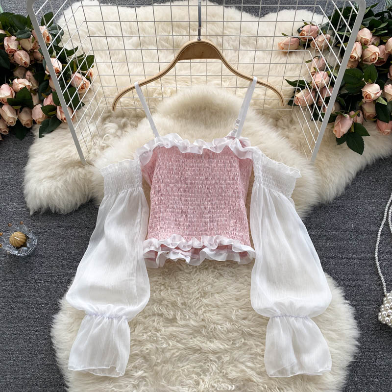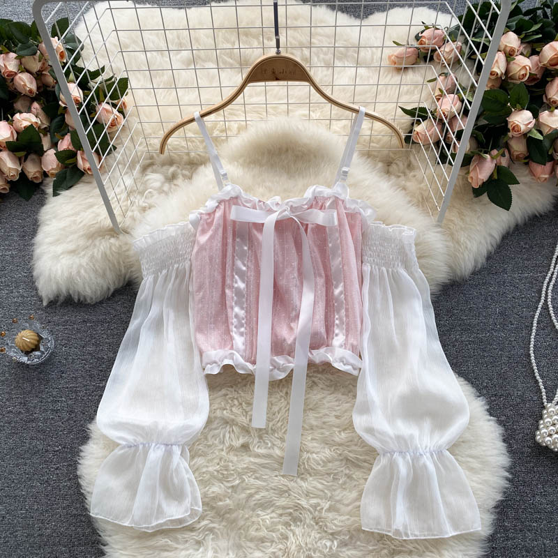Autumn Sweet Pink/Blue Mesh Patchwork Blouse Women Sexy Slash Neck Off Shoulder Strapless Tops Female Flare Long Sleeve Shirts