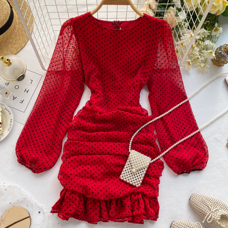 Cheap Dresses, Buy Quality Women’s Clothing Directly from China Suppliers:Runway Designer Beige/Black/Green/Red Polka Dot Mini Dress Spring Summer Long Sleeve Round Neck Slim Ruffle Boho Dress