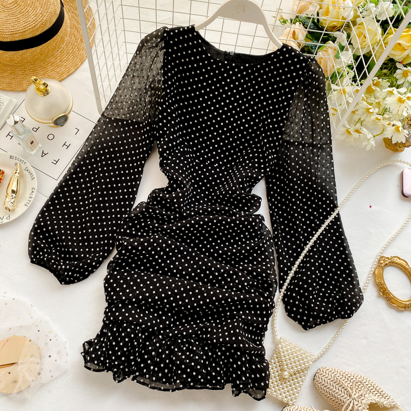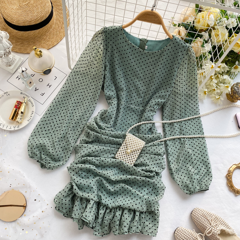 Runway Designer Beige/Black/Green/Red Polka Dot Mini Dress Spring Summer Long Sleeve Round Neck Slim Ruffle Boho Dress