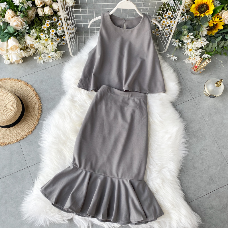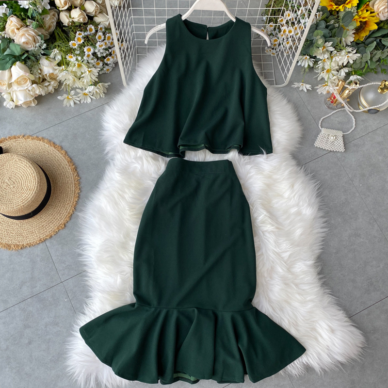 European New Fashion Summer Women Two Piece Set Casual Sleeveless Round Neck Tops + Mermaid Skirt Green/Blue/Black 2pc Set