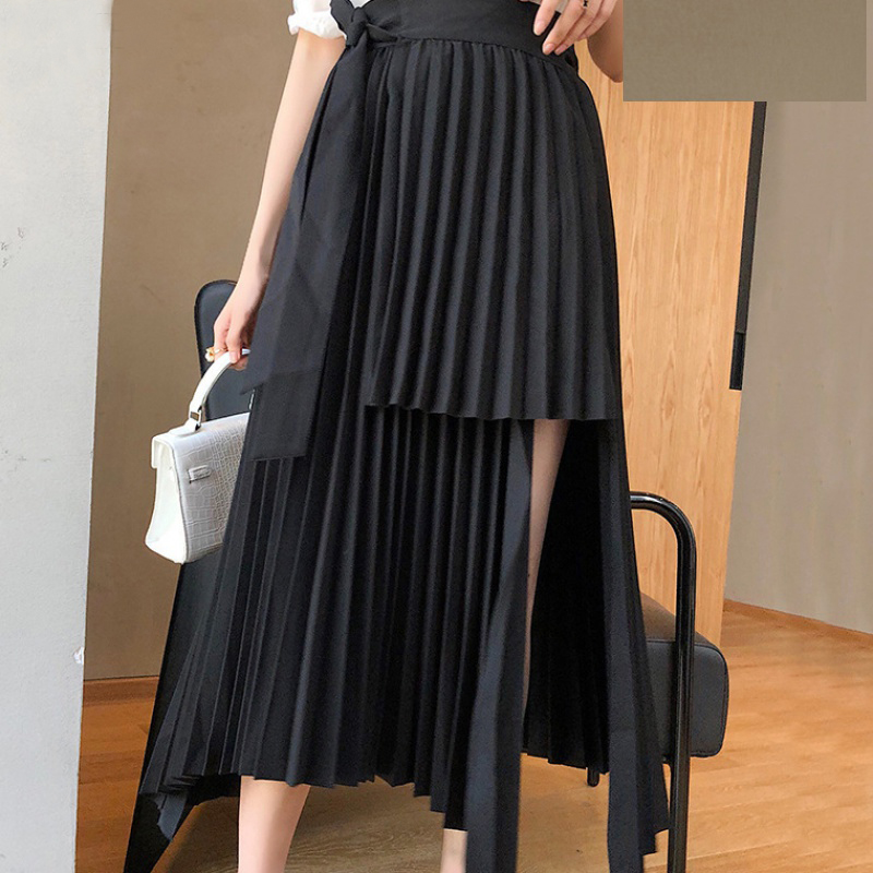 Spring Irregular Sashes Mid Calf Women Pleated Skirt Khaki Pleated Skirt Vintage High Waist Casual Skirts Female Faldas New