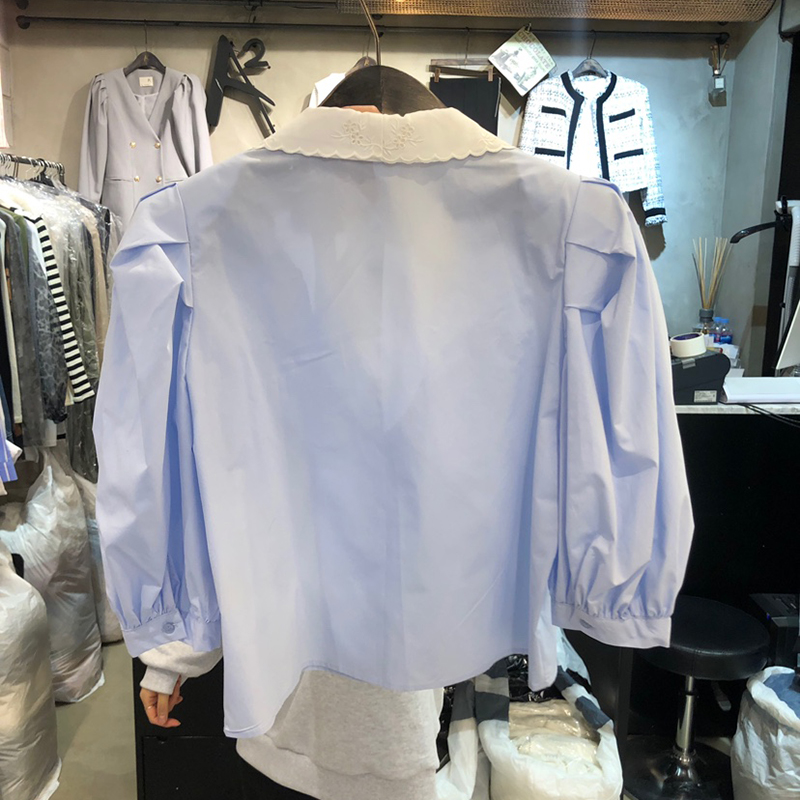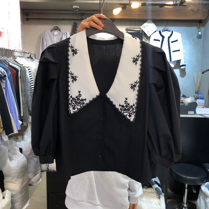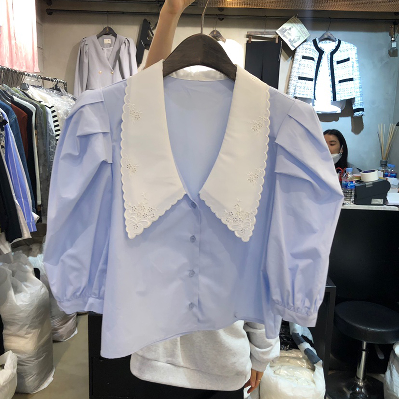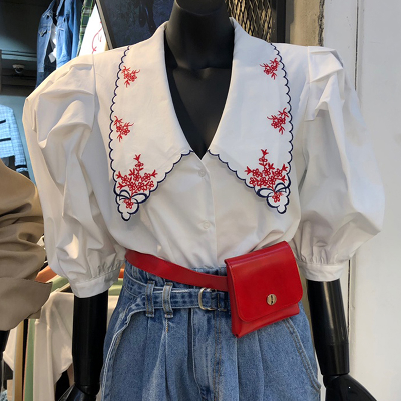 Cheap Blouses & Shirts, Buy Quality Women’s Clothing Directly from China Suppliers:Korean Turn down Collar Floral Embroidery Blouse Summer Puff Half Sleeve Blue/Black/White Short Shirt For Female Blusas