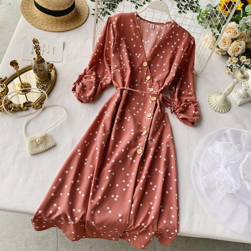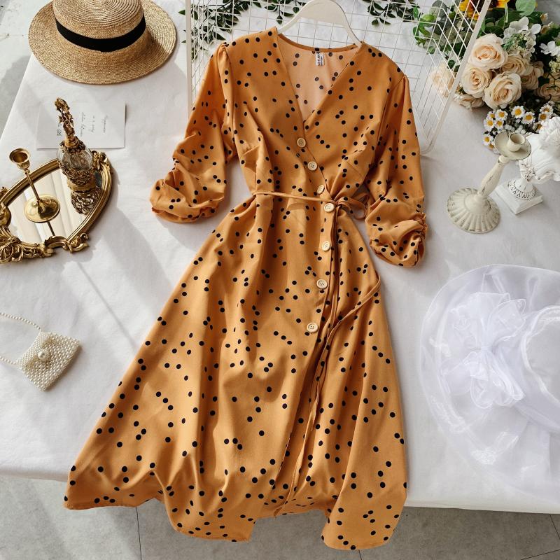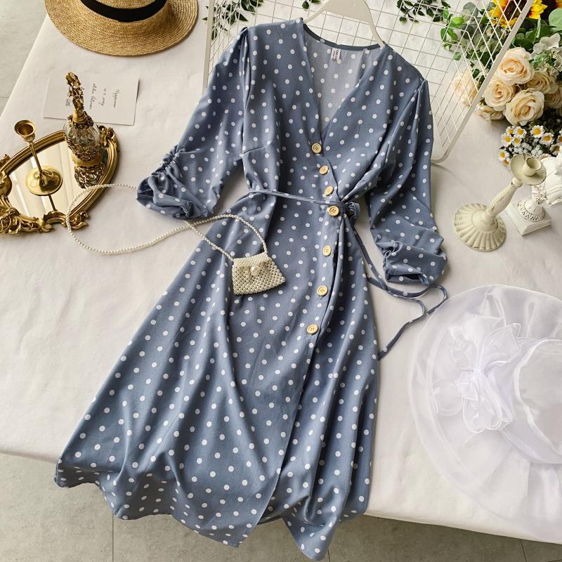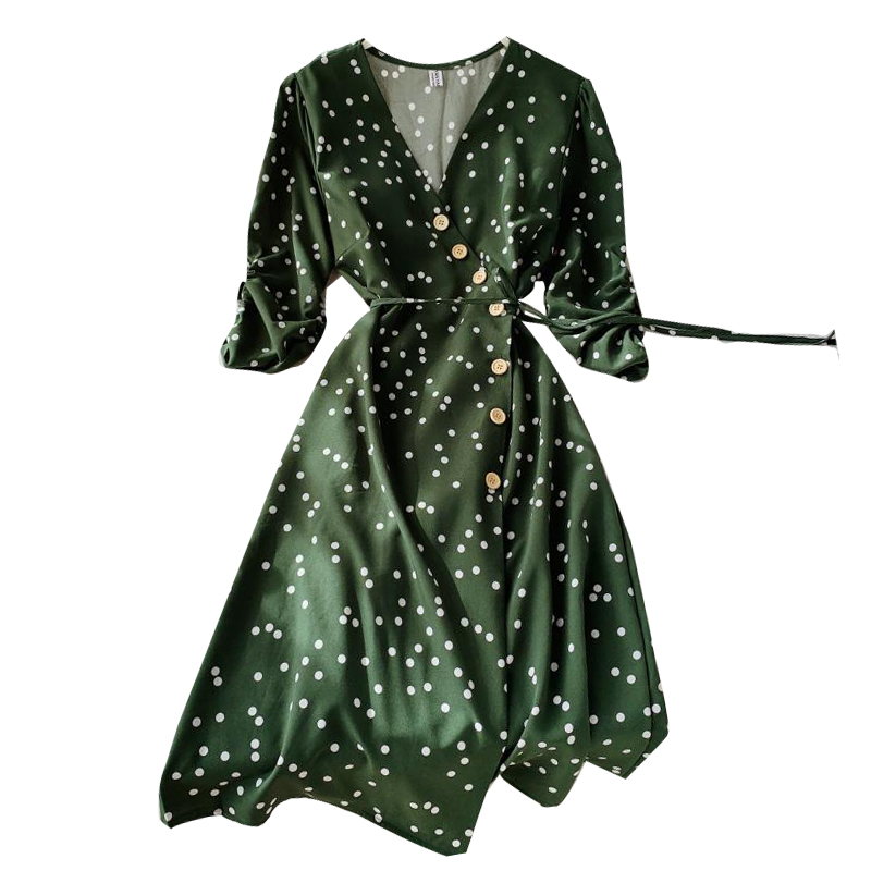 Vintage Women Polka Dot Dress Summer V-neck Single Breasted Vestidos Verano Casual Yellow/Blue/Green High Waist Dresses New