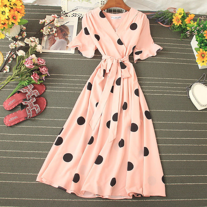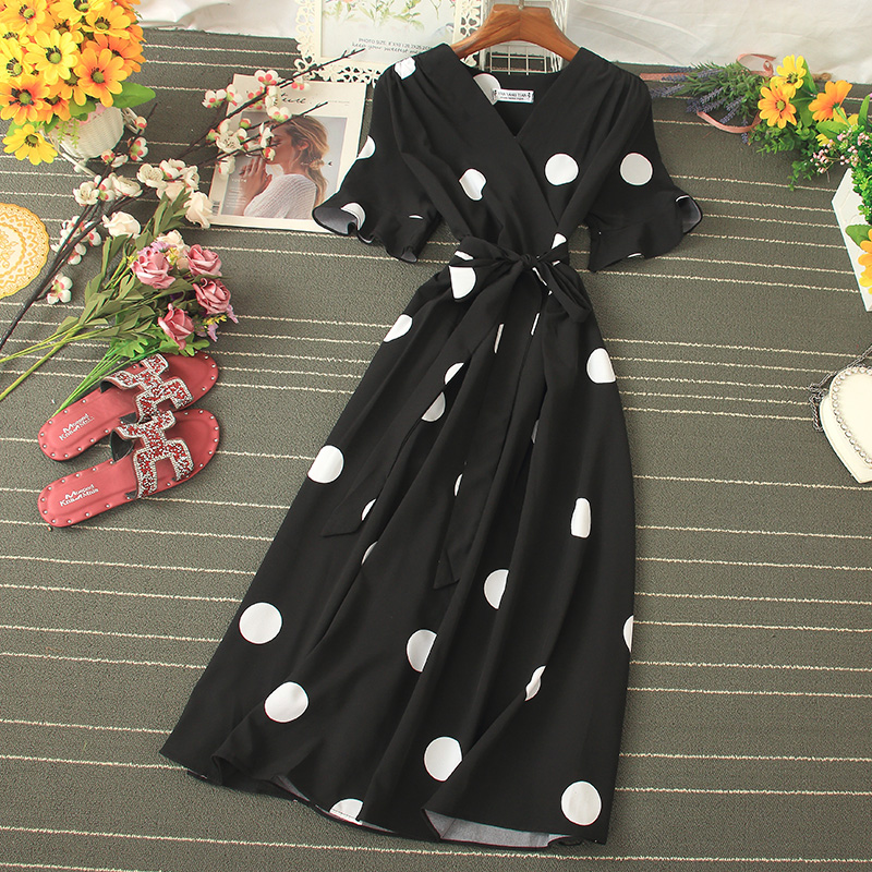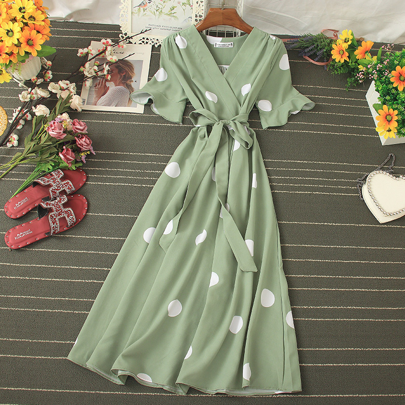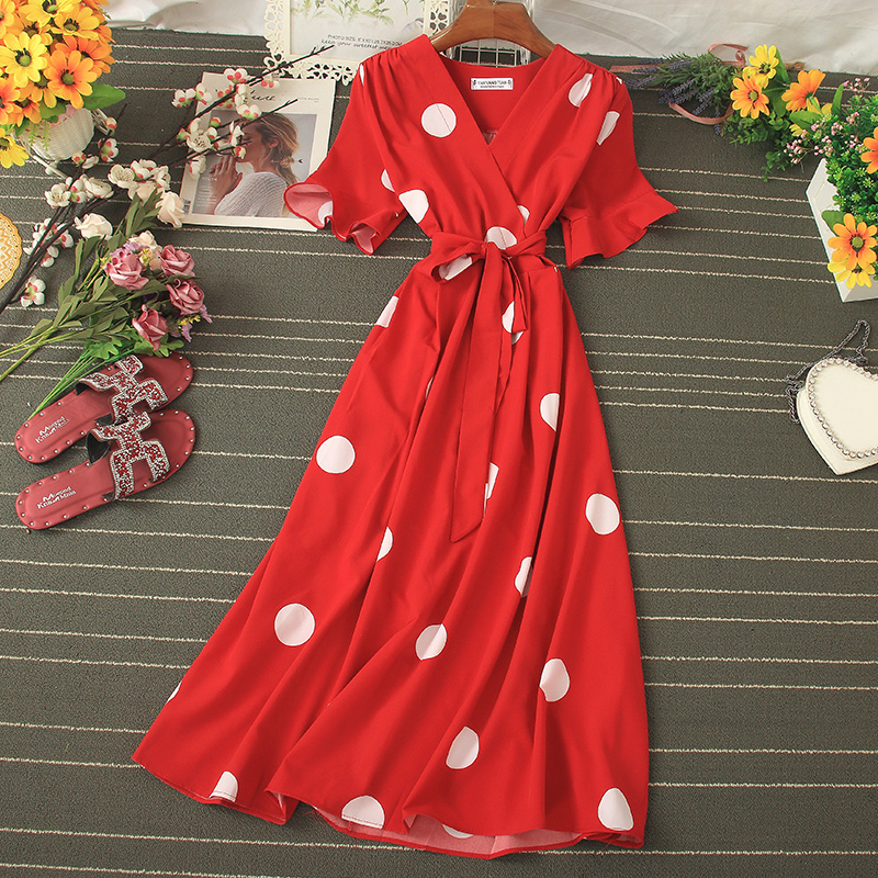 Vintage Polka Dot Midi Dress Summer Sexy V-neck Flare Sleeve Casual Vestidos Verano Elegant Blue/White Sashes Dresses New