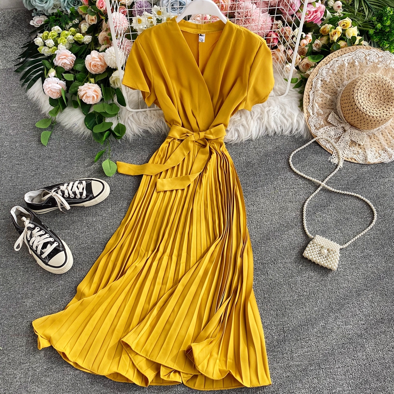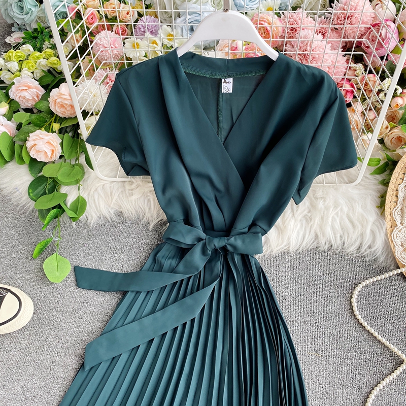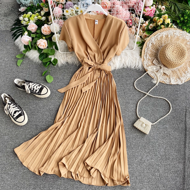 Summer Elegant Solid Women Pleated Dress Casual Short Sleeve Sashes Dresses Vintage High Waist Slim Beige/Green Dress New