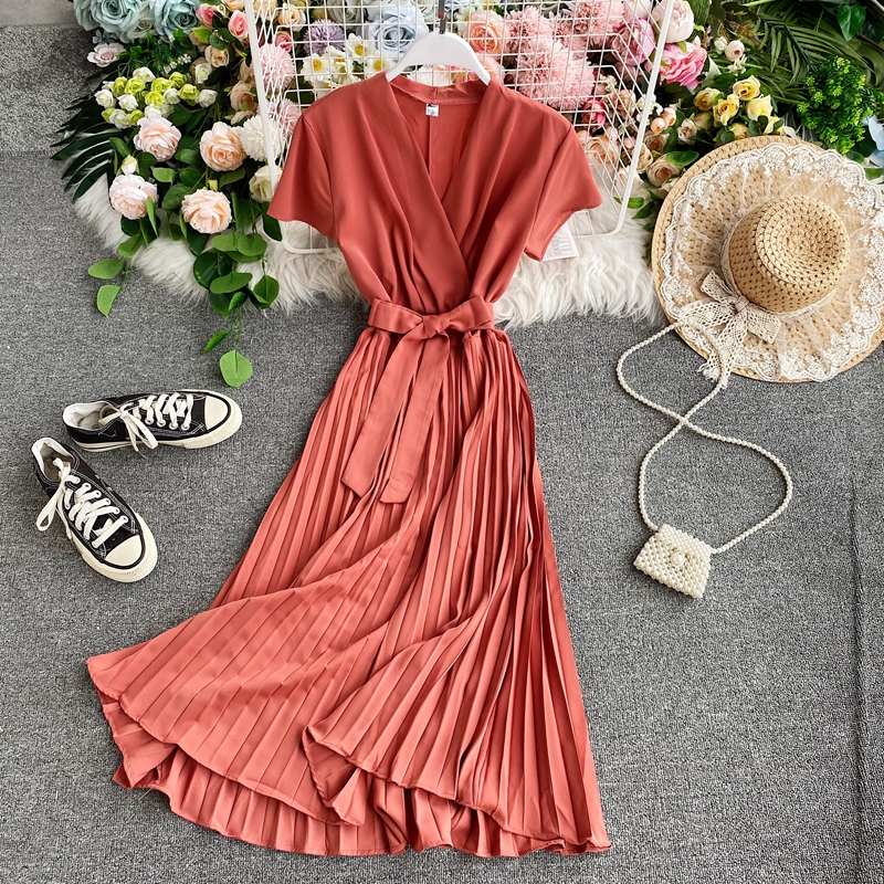Cheap Dresses, Buy Quality Women’s Clothing Directly from China Suppliers:Summer Elegant Solid Women Pleated Dress Casual Short Sleeve Sashes Dresses Vintage High Waist Slim Beige/Green Dress New