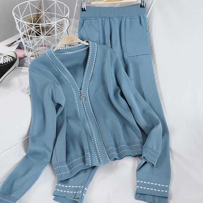 Cheap Pant Suits, Buy Quality Women’s Clothing Directly from China Suppliers:Casual Blue/Black Knitted Two Piece Set Autumn Zipper Cardigans Tops + Double Pockets Pants Vintage Knit 2pcs Set Suit