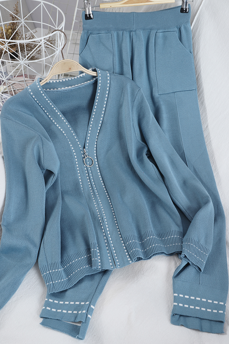 Casual Blue/Black Knitted Two Piece Set Autumn Zipper Cardigans Tops + Double Pockets Pants Vintage Knit 2pcs Set Suit