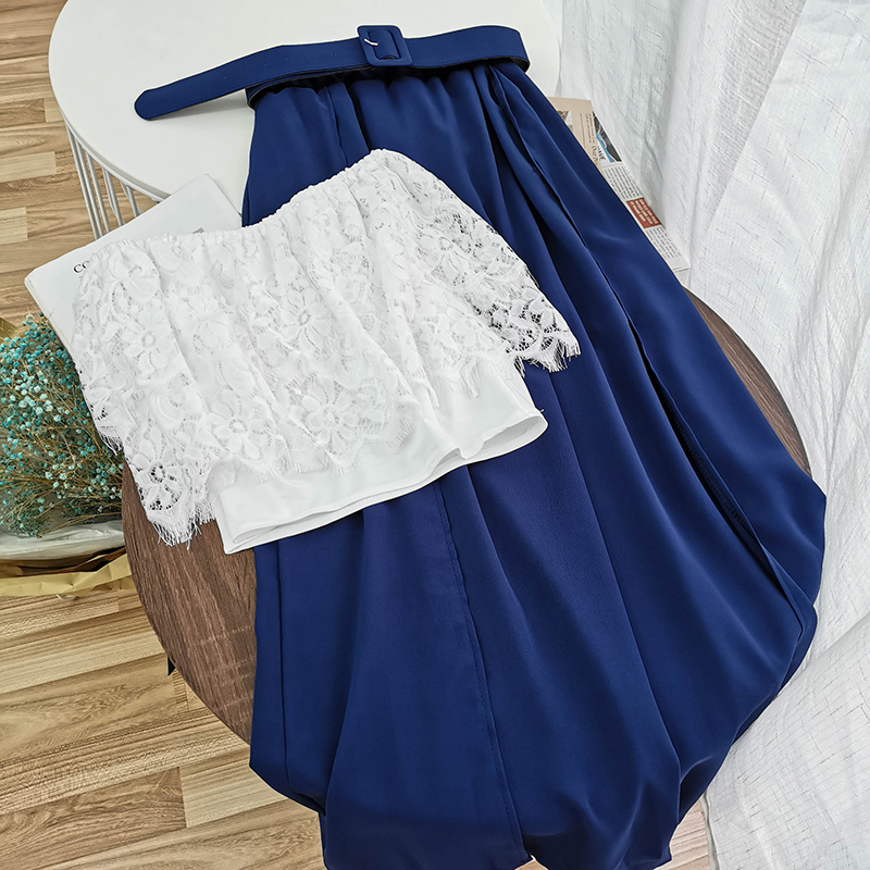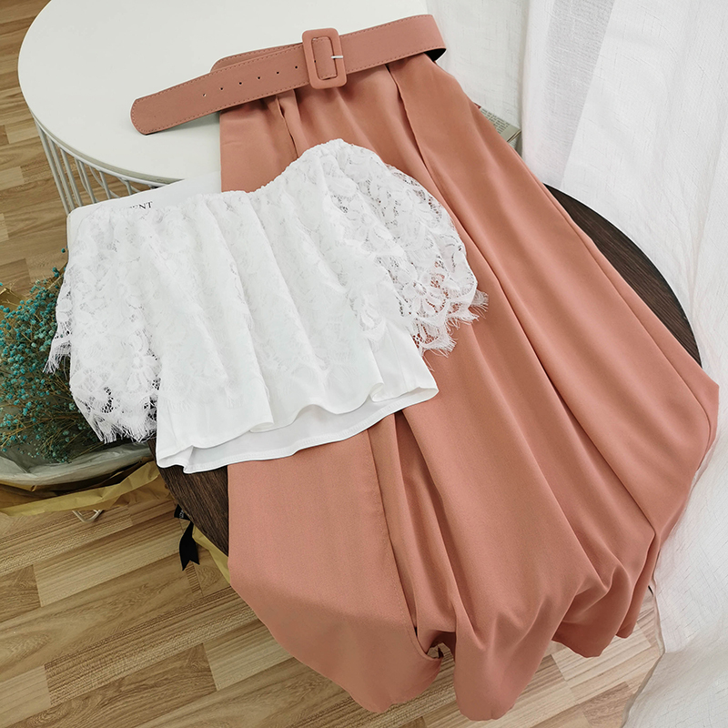 Women Sexy Two Piece Set Elegant Slash Neck Short Lace Short Tops + High Waist Pink/Blue/Khaki Skirt Female 2pcs Sets Suit