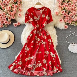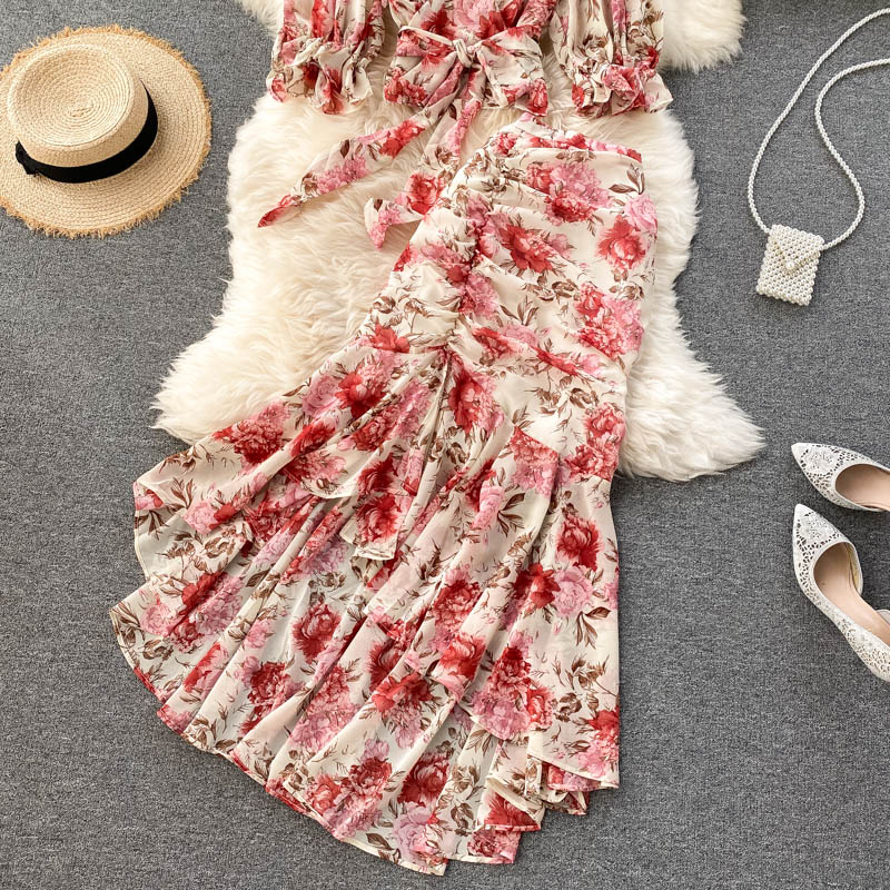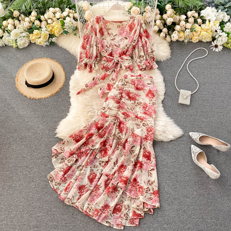 Cheap Dress Suits, Buy Quality Women’s Clothing Directly from China Suppliers:Bohemian Pink/Blue Floral Print Chiffon 2pcs Set Women Summer Bandage Short Tops + High Waist Mermaid Skirt Female Sets New
